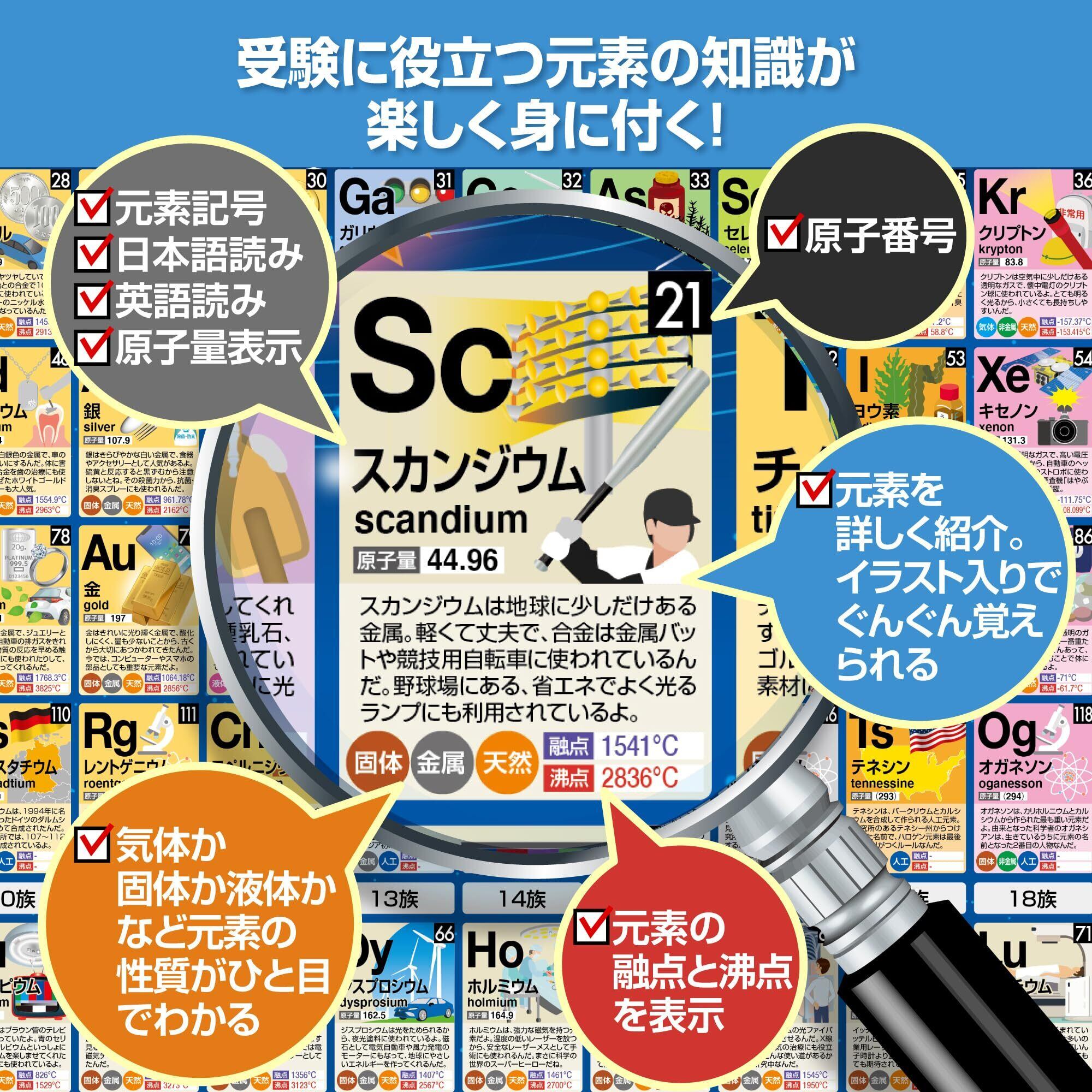 学習効果を高める構成:ポスターは、単に元素を羅列するだけでなく、関連する豆知識や面白い事実も記載されており、学習効果を高めるための工夫が随所に見られます。また、語呂合わせなどの記憶術も取り入れられており、テスト対策にも効果的です。