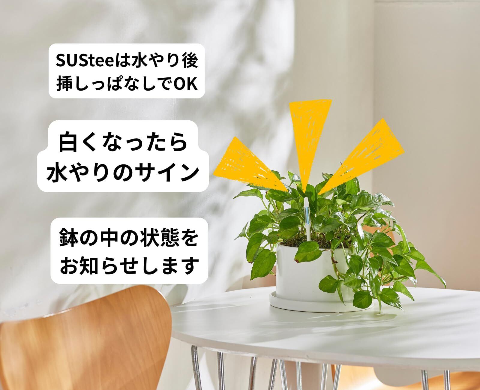 「『SUStee 水やりチェッカー』は、あなたの大切な植物を健康に保つために設計された必携アイテムです!シンプルでスタイリッシュなホワイトのデザインが、どんなインテリアにも溶け込みます。」