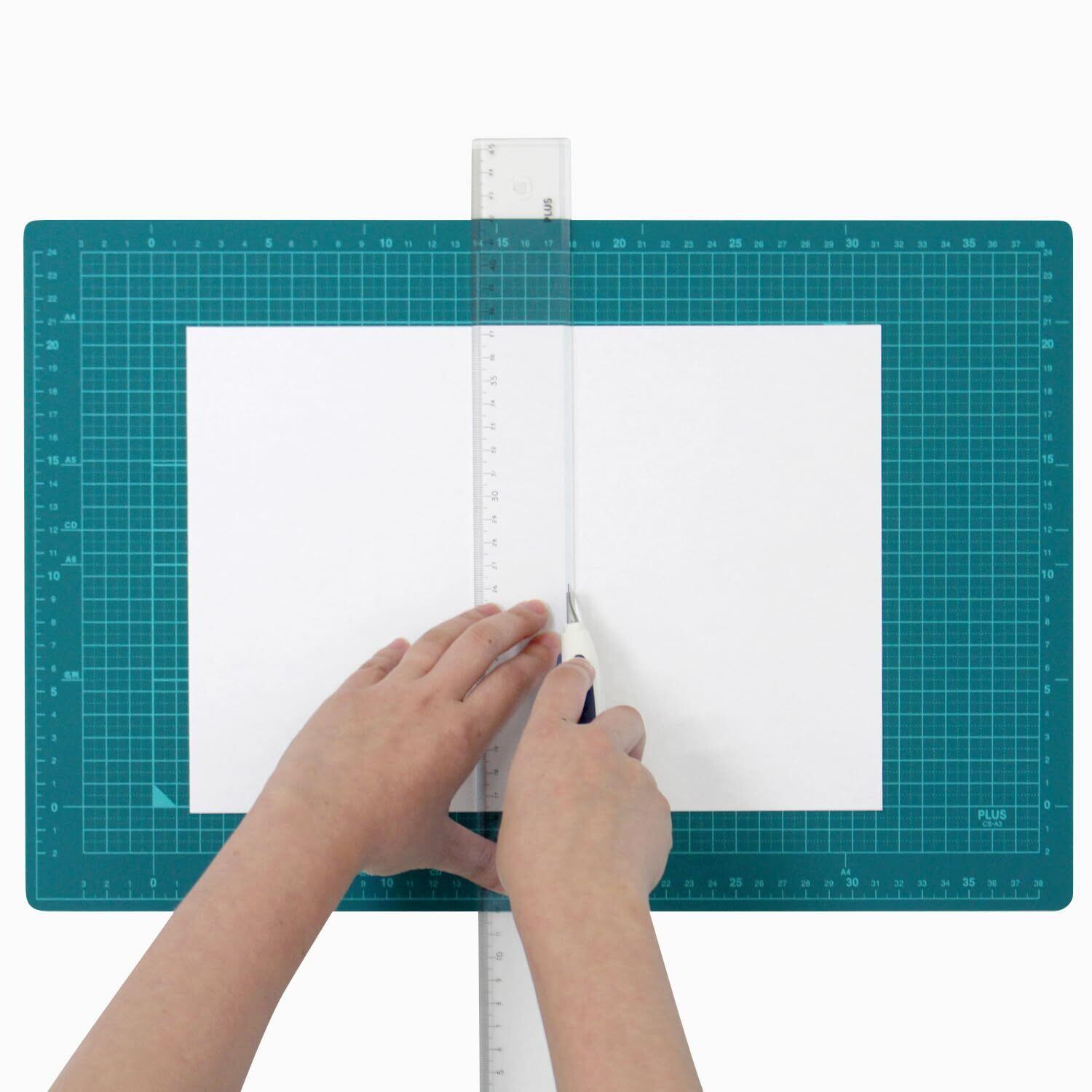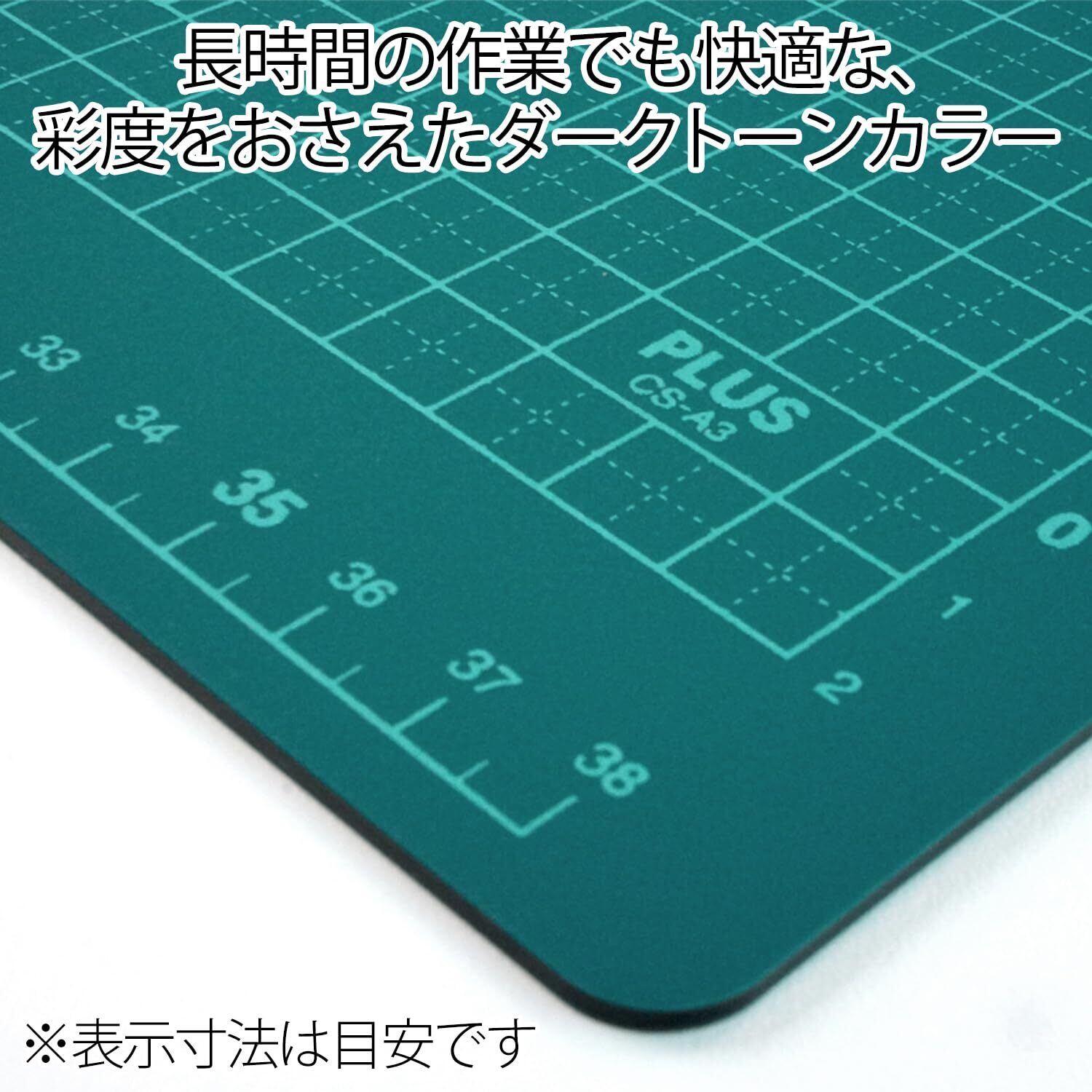 「『プラス カッターマット』は、さまざまな工作や裁断作業をサポートする高品質なカッターマットです!両面使用可能なこのマットは、どちらの面でも使用でき、長期間の使用にも耐える丈夫な設計が特徴です。」
