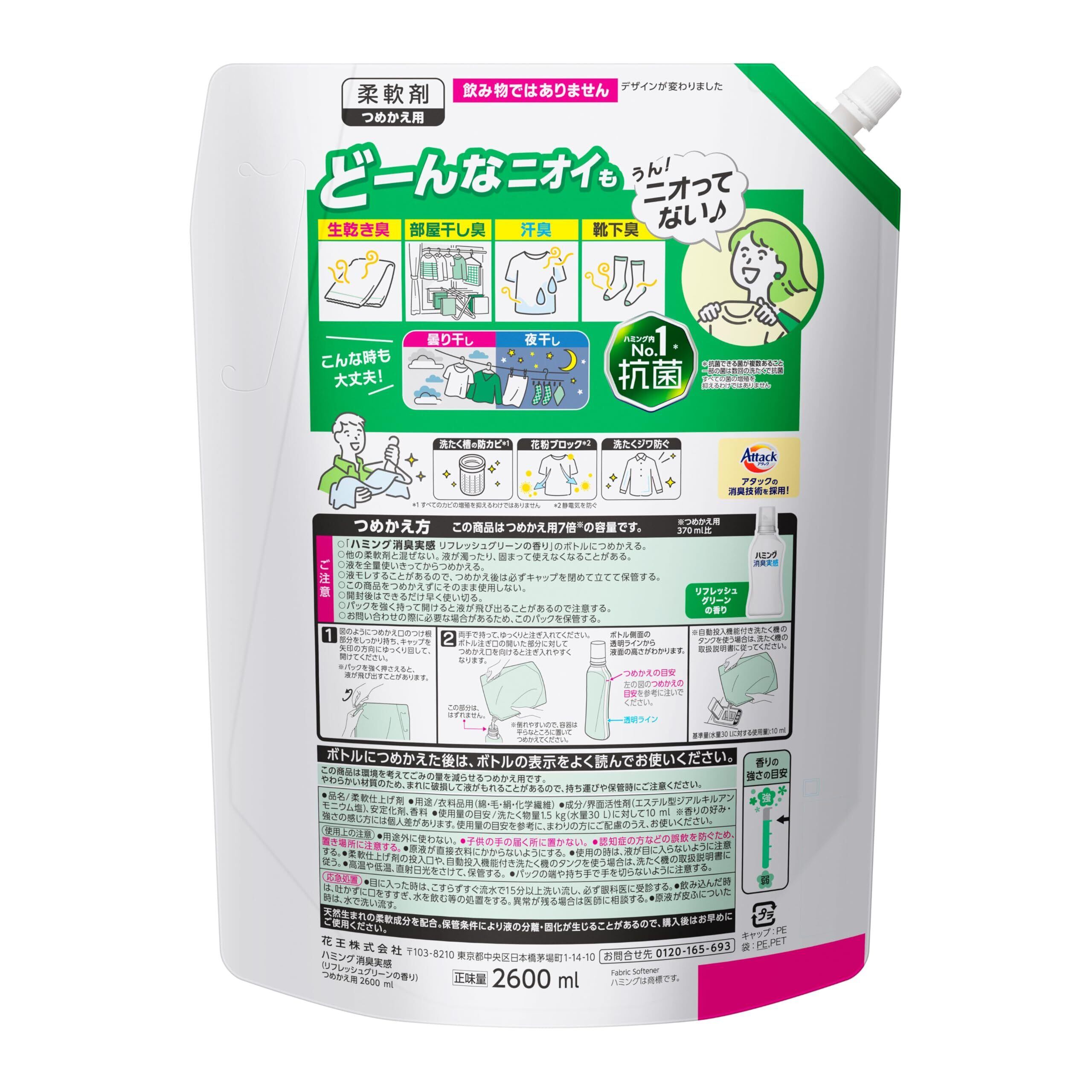 【新着商品】ハミング 【大容量】消臭実感 柔軟剤 つめこみ洗いも、部屋干しも、無敵消臭! 内No.1抗菌 リフレッシュグリーンの香り つめかえ用 2600ml