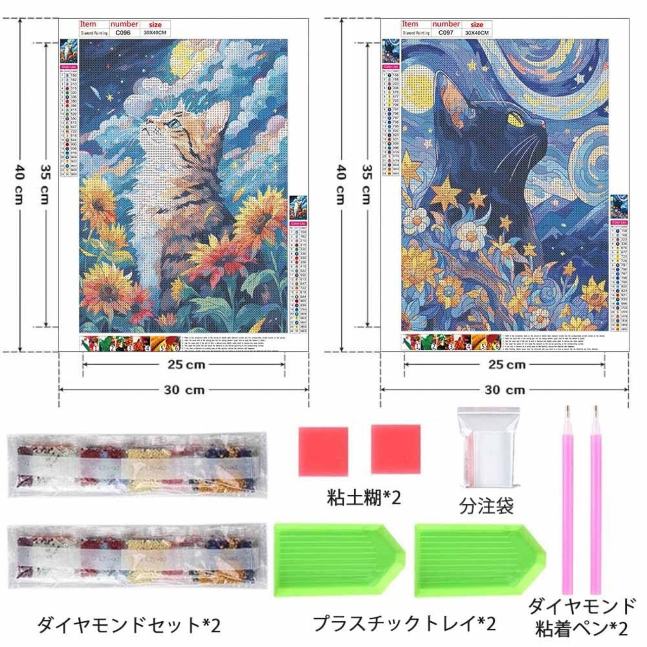 セット内容:ダイヤモンド絵画セット2セット(フレームを含まない)、ダイヤモンドセット+ダイヤモンド粘筆+プラスチックトレイ+油絵布+粘土糊各2点を含む、および分注袋数個。油絵布サイズ:約30×40cm、操作サイズ:約25cm*35cm。