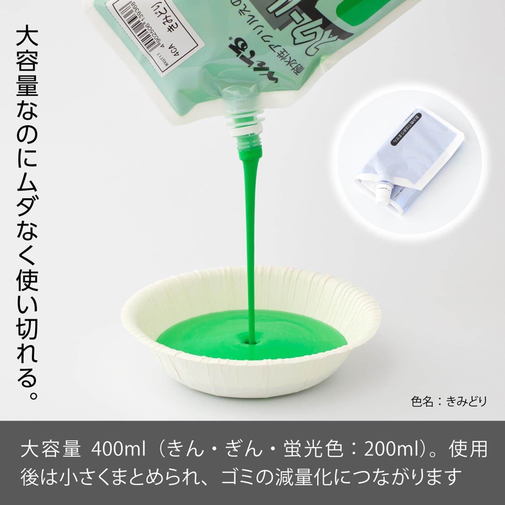 「『ぺんてる 絵の具 スクールガッシュ』は、鮮やかな発色と使いやすさが魅力の水性タイプの絵の具です!きみどりは、作品に明るい開放感を与え、さまざまなアート表現に役立つ色合いです。」