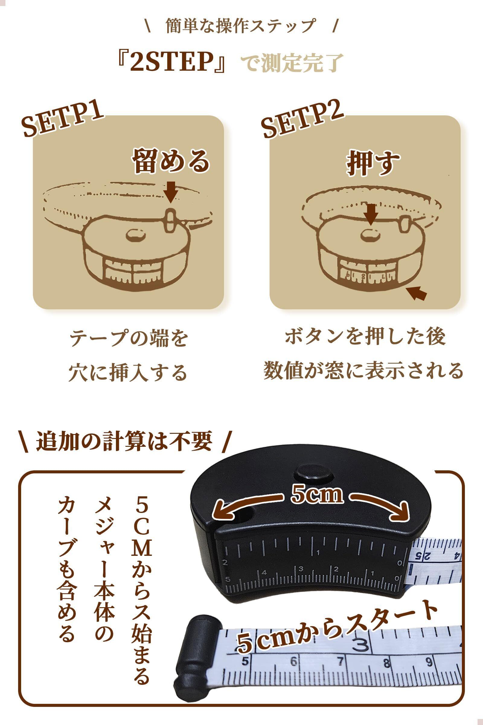 【簡単な操作ステップ】STEP1: テープを測定物に巻き、テープの端を穴に挿入します。STEP2: ボタンを押して、テープを収縮させて、数値はのぞき窓に表示されます。【ご注意】テープの戻る速度を制限しているため、急に戻って怪我をする心配はありません。場合によっては2〜3回ボタンを押す必要があります