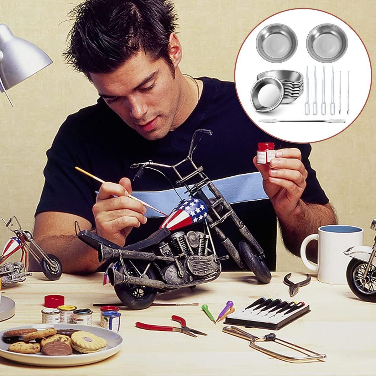 プラモデル 塗装セット:ステンレス製筆洗(大皿)×2枚,ステンレス製の塗料皿×12枚,スポイト×4枚(3ml),スプーン形調色スティック×2,両端タイプかくはん棒×1,合計21点セット、お得です。