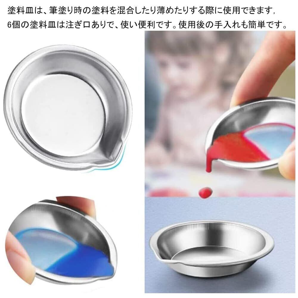 このセットには、6本の塗料皿とステンレス製筆洗が2枚含まれており、塗装作業をスムーズに行えるよう配慮されています。複数の色を同時に使いたい時や、色の調合が必要な時にとても便利です。