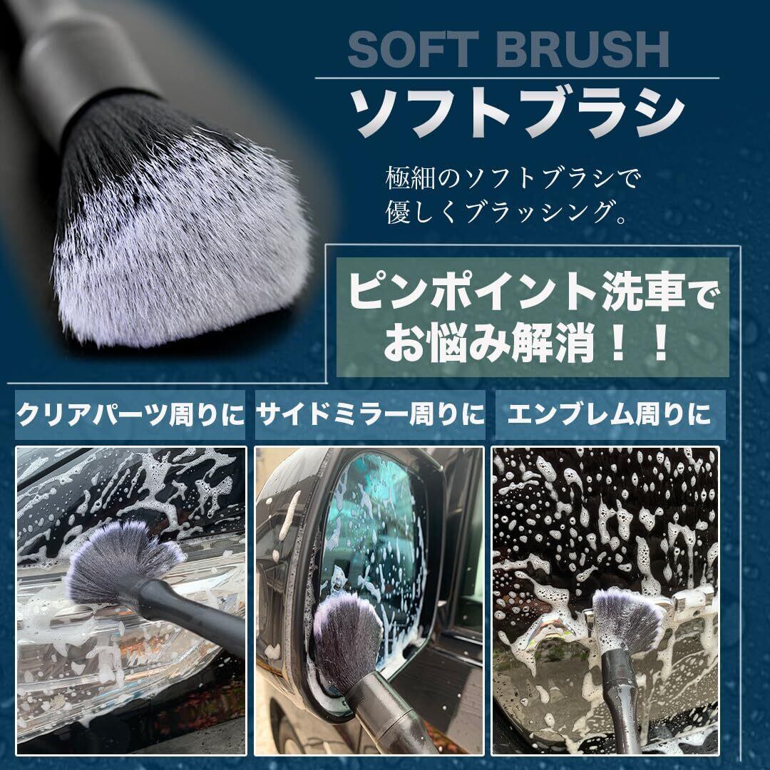 【使いやすい5種類セット】ディテールブラシは硬さの異なる3本セットで様々なシーンでお使いいただけます。車内の掃除だけでなく、車体、ホイール、掃除が難しい隙間の掃除にも使用できます。 【ソフト】: 柔らかいブラシを使用すると、傷を効果的に防ぐことができます。 【ミディアム】: 豚毛ブラシ。主に車のロゴ、車のグリル、ヘッドライトの隙間、車体の隙間などのやや硬い部分の清掃に使用されます。 【ハード】: ハードの洗車ブラシで狭い隙間や強固な汚れに最適なブラシ。強力な洗浄力で、ホイールハブ、エンジンギャップなどの汚れたディテールを洗浄できます。ハードの洗車ブラシは、車の内部を掃除しないように推奨します。