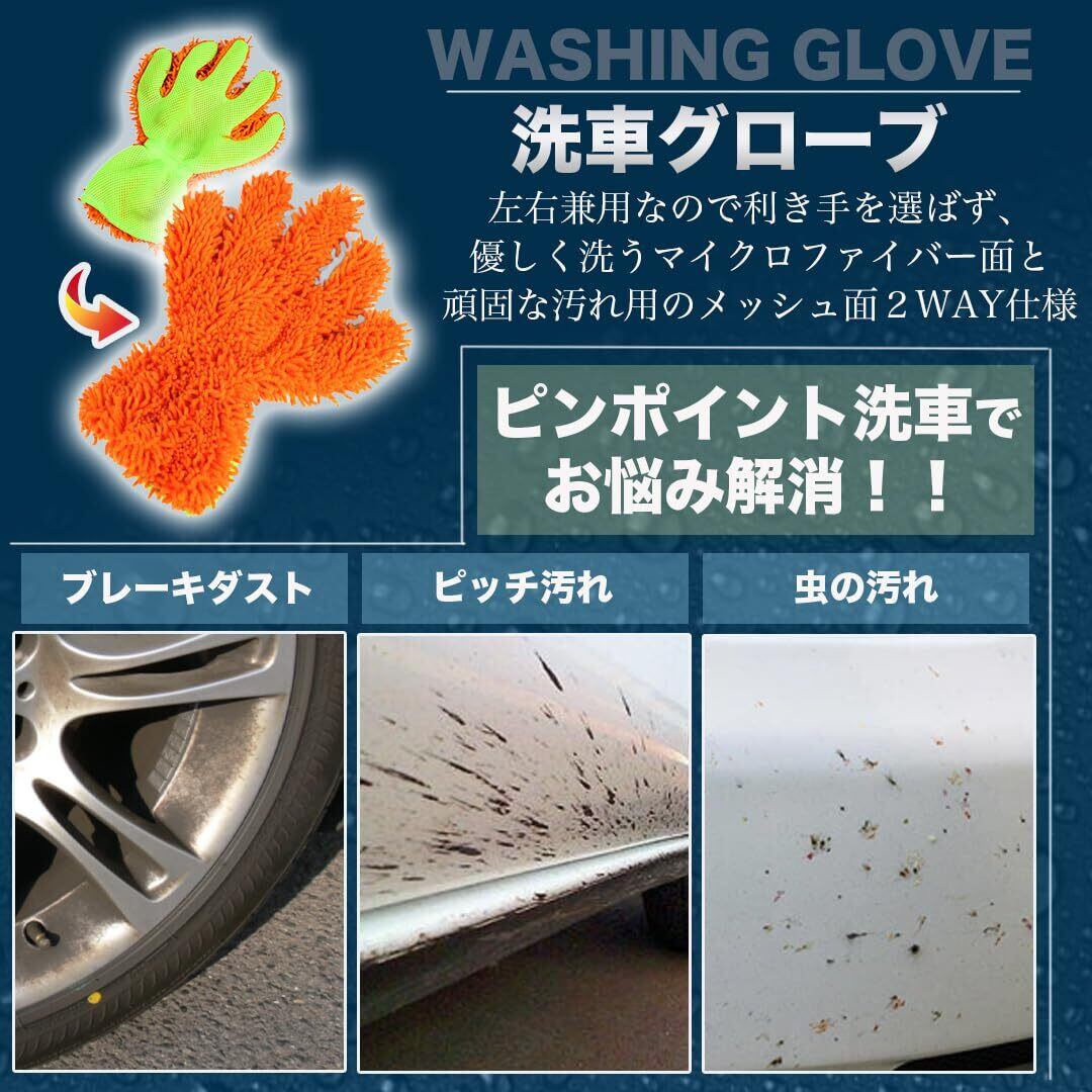 オプション②【洗車グローブ】素手感覚で洗車可能。スポークの裏やグリルの隙間、タイヤハウス、ドアノブの隙間、バイザーなど様々な用途で使用できます。 左右兼用なので利き手を選ばず、優しく洗うマイクロファイバー面と頑固な汚れ用のメッシュ面2WAY仕様。乾拭きにも対応しているので車内の清掃にも○