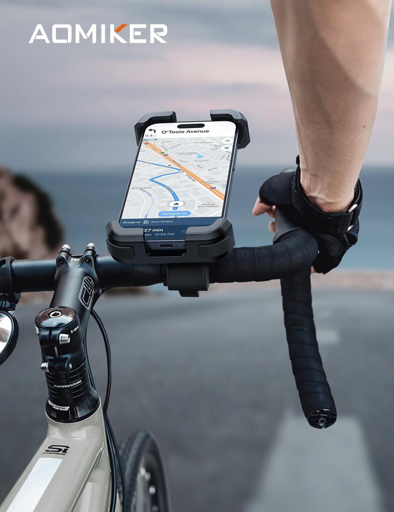「『Aomiker バイク スマホ ホルダー スタンド』は、バイクや自転車に最適な、スマートフォンを固定するためのスタンドです!360度回転可能で、どんな角度でも快適に操作できるのが大きな魅力です。」