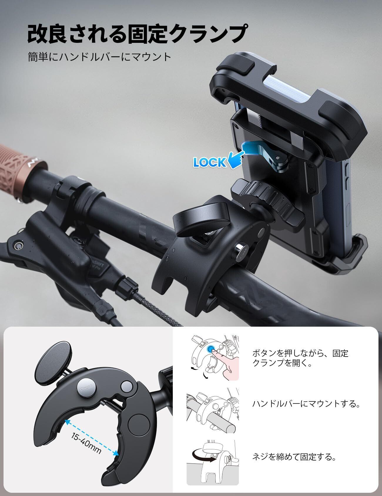 【操作簡単の固定クランプ】バイクスマホホルダーはネジタイプの固定クランプに取り付けボタンが設置され、工具不要で取り付けるだけでなく、普通ネジタイプ固定クランプよりも速く取り付けることができます。すまほホルダーはハンドル径の対応が幅広いで、15-40mmハンドル径に対応でき、市販されているハンドルバー、延長バーはほとんど合わせます。