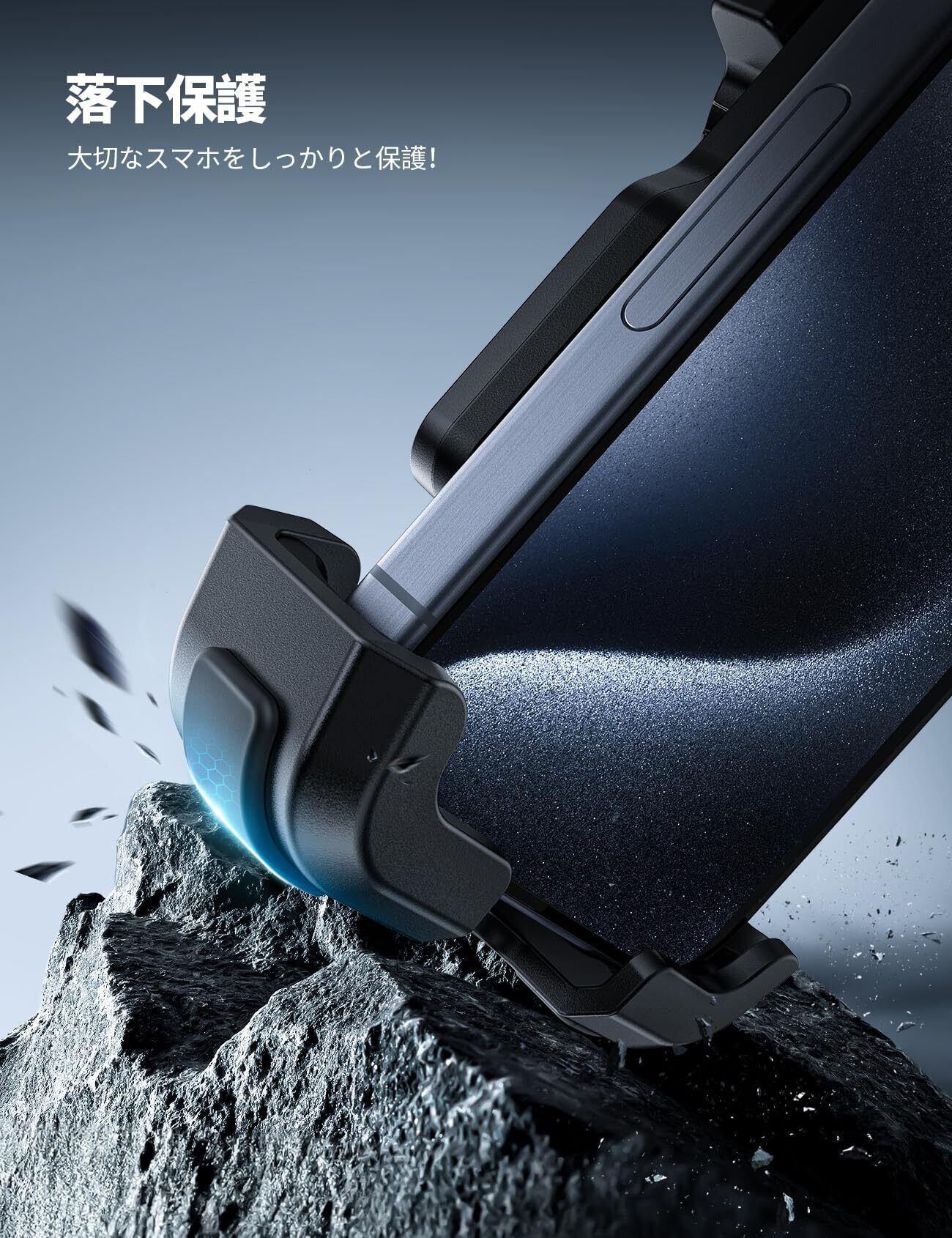 「本商品は強力なクリンチングデザインを採用しており、走行中の振動を吸収しつつ、スマホをしっかりと固定します。これにより、安心してナビゲーションや音楽再生を楽しむことができます!」