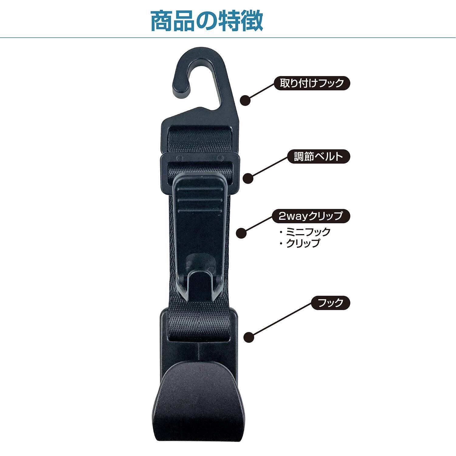 【掛けるも挟むもできる多用途フック】車内のヘッドレストシャフトに引っ掛けるだけで簡単に取り付けられ、長さ調節ができる便利なフックです。