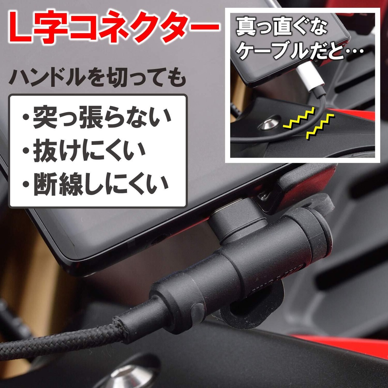 「L字型のコネクターは、狭いスペースでも楽に接続でき、ケーブルの断線を防ぎます。バイクのハンドル周りにぴったりフィットし、邪魔になりません!」