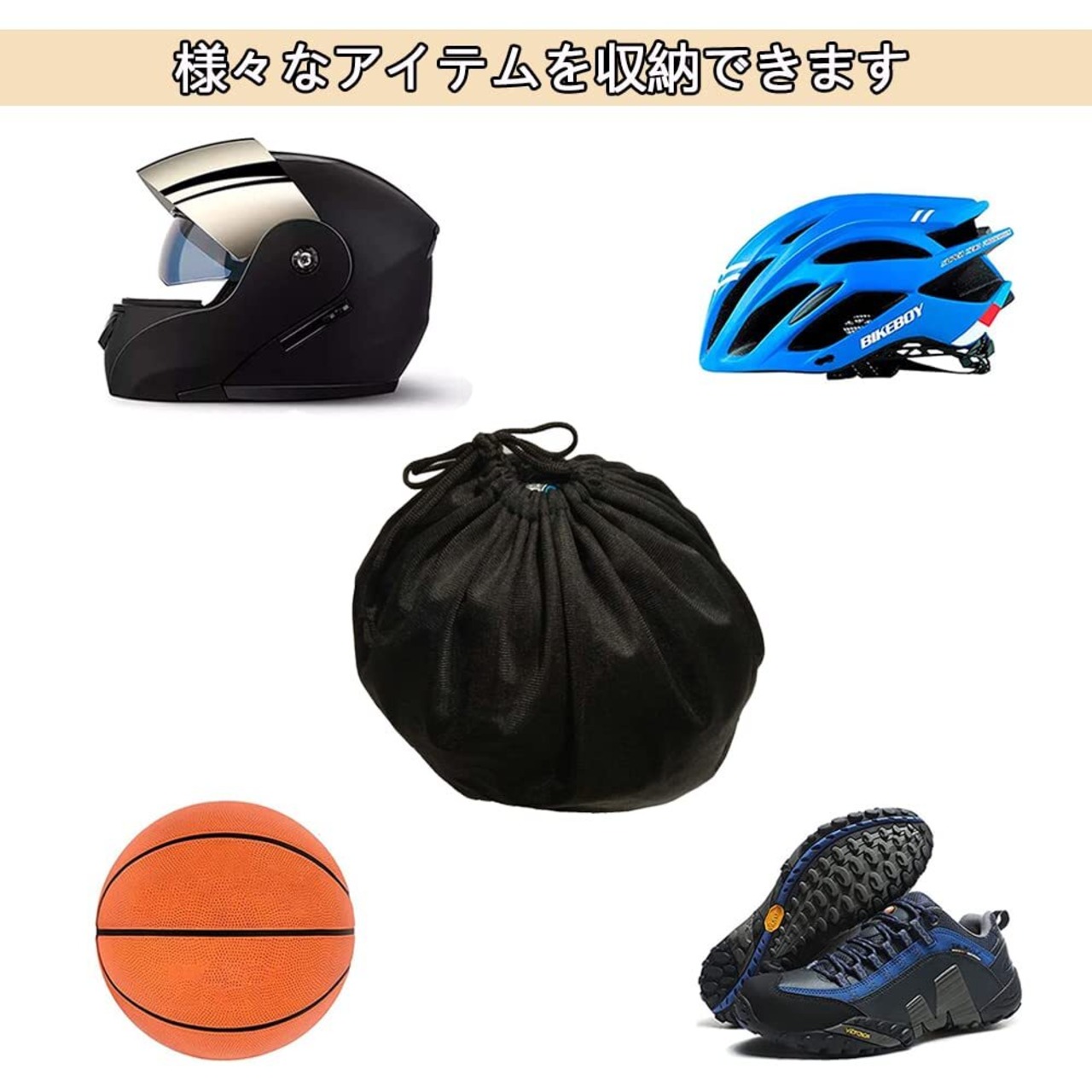 【幅広い用途】バイクヘルメットやポーツ用ボールが収納できるし、シューズ入れや、着替え、小物入れなどとして幅広く活躍します。