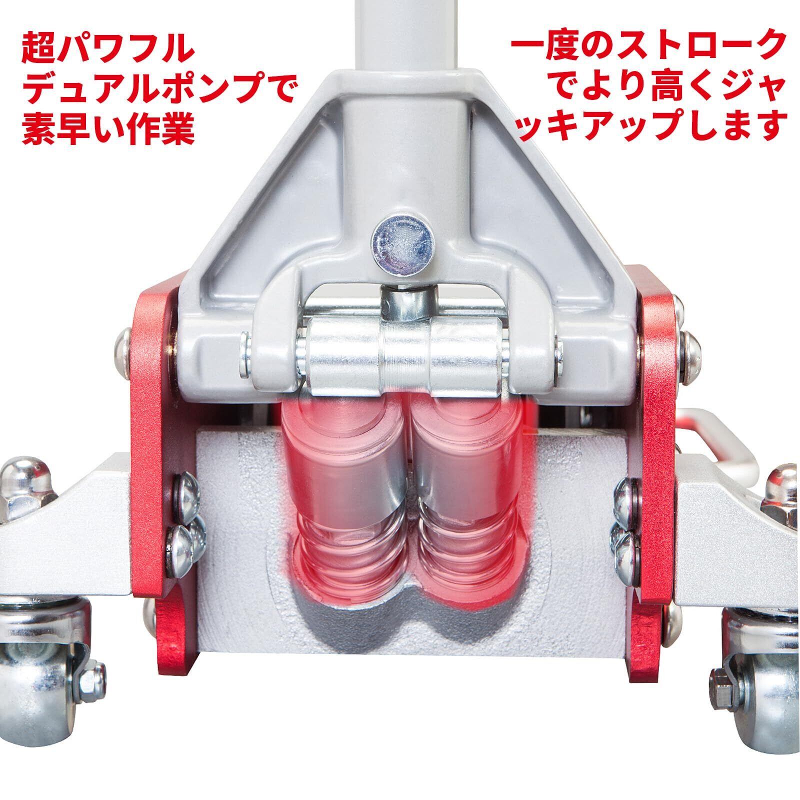【最大耐荷重3トン・保護パッド付き】最大耐荷重3トンを備えており、ローダウン車、大型のミニバン、プラドなど幅広い車類の整備やタイヤ交換に使用できます。デュアルポンプを採用しているため、パワフルにジャッキアップできます。少ない回数で簡単に持ち上がます。ゴムパッドを標準装備。車を傷つけず、すべりによる事故も防ぎます