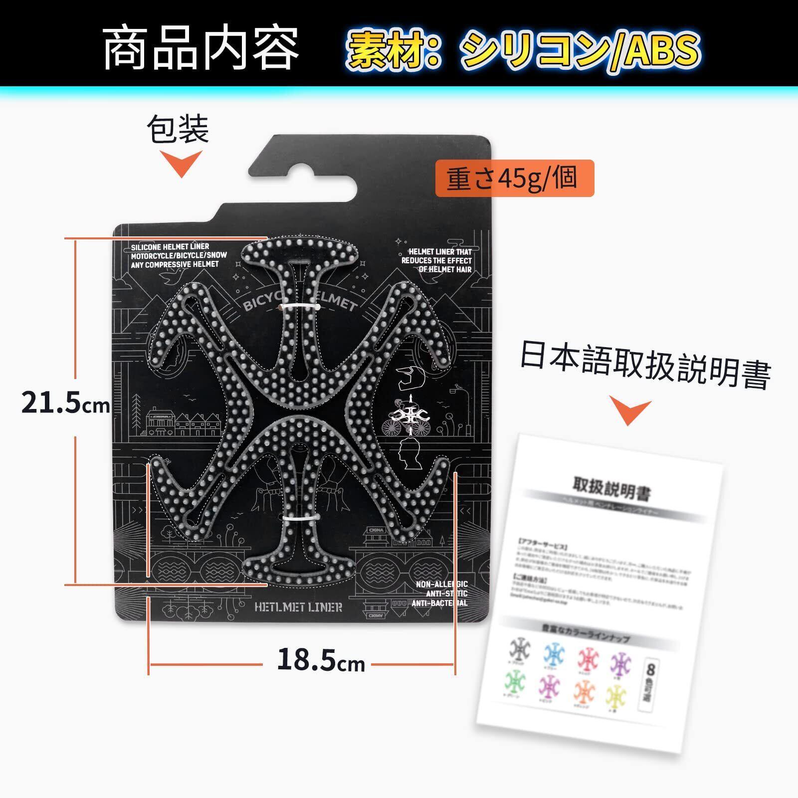 【通気性・脱臭】ヘルメットと頭皮の間に物理的な空間を作り出し、ヘルメット内部に空気の流れを生みだします。ヘルメットパッドは通気性に優れ、発汗によるバクテリアの繁殖を効果的に減らし、ヘルメットの裏地の汚染を防ぎ、抗菌、乾燥、透気、脱臭、異臭なし、季節問わず(春、夏、秋、冬)快適にご使用いただけます。素材:シリコン/ABS 本体サイズ:21.5×18.5×0.8cm 重さ45g/個 本体の厚さ8mm 歯先の長さ5mm