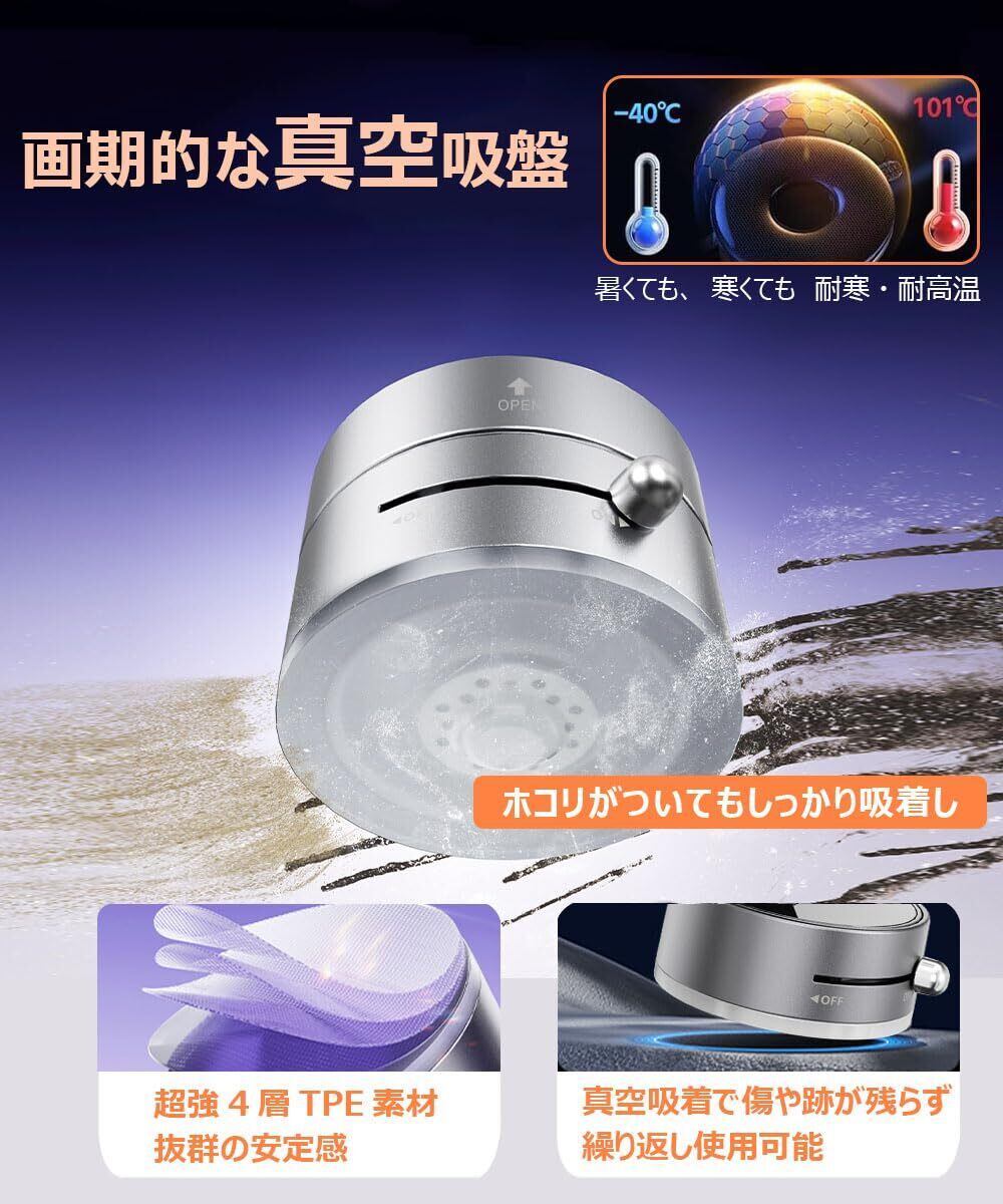 【抜群の安定感】真空吸盤は超強4層TPE素材で、耐寒・耐熱性(-4℃/110℃)が抜群です。真空吸着で傷や跡が残らず繰り返して、ホコリがついても吸着可能です。