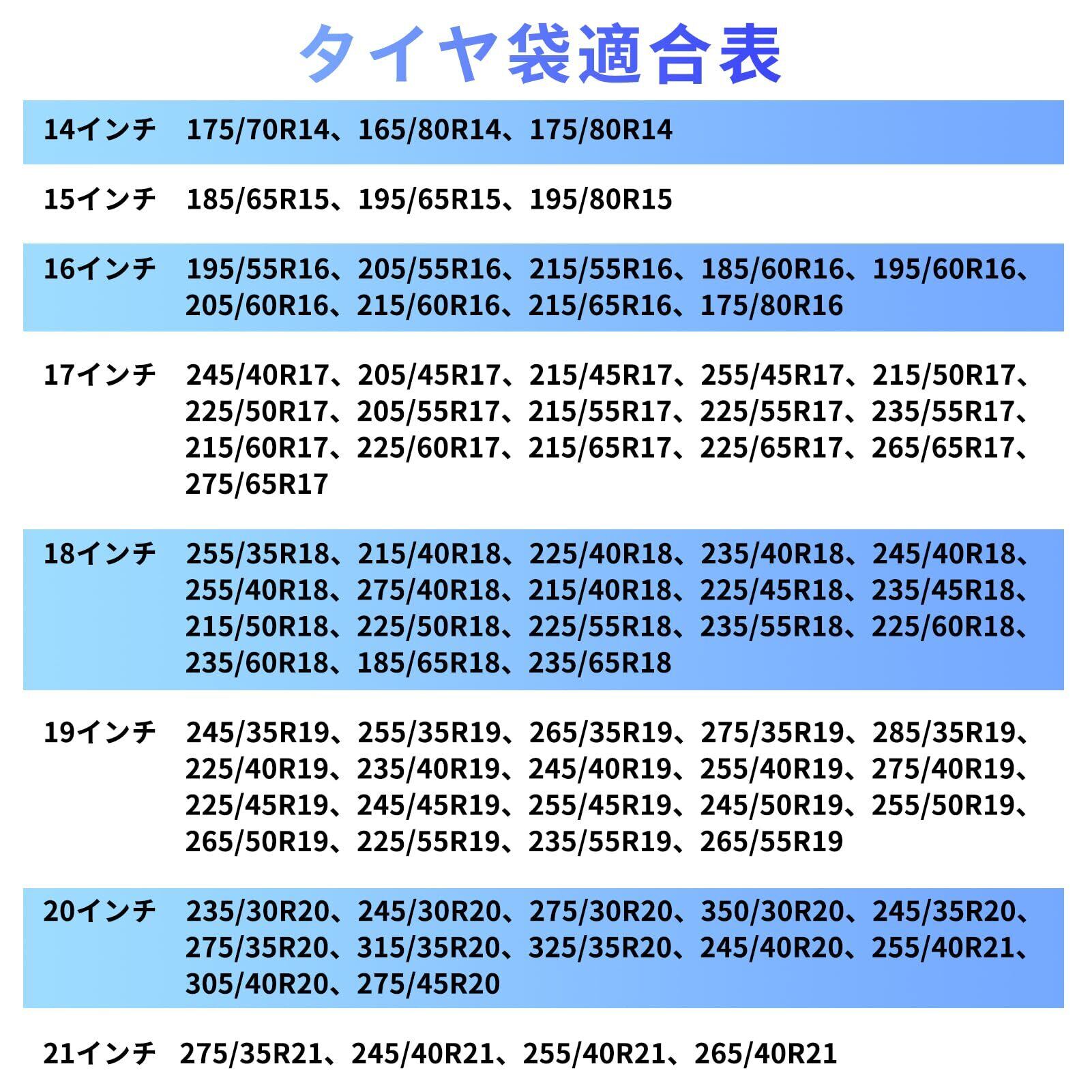 「0.05MMのしっかりとしたビニール素材を採用しており、耐久性に優れています。雨や雪、紫外線からタイヤを守り、劣化を防ぎます。特に屋外に保管する際に最適です。」