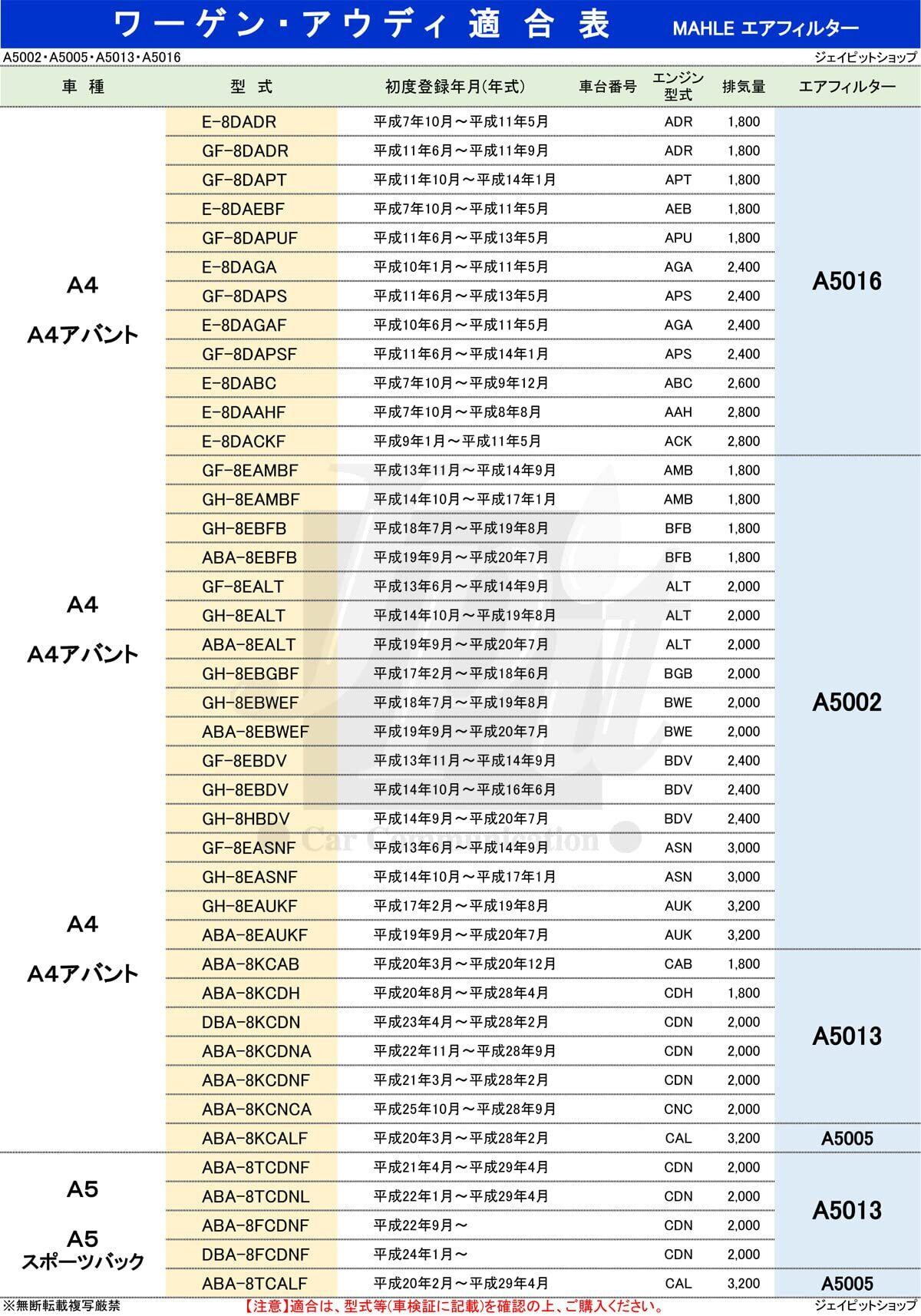 「こちらのエアフィルターは、アウディ A4、A4アバント、A5、A5スポーツバック、Q5、A4オールロードクワトロ、ハイブリッド車に対応します。ご購入前に、必ず型式の適合確認をお願い致します。」