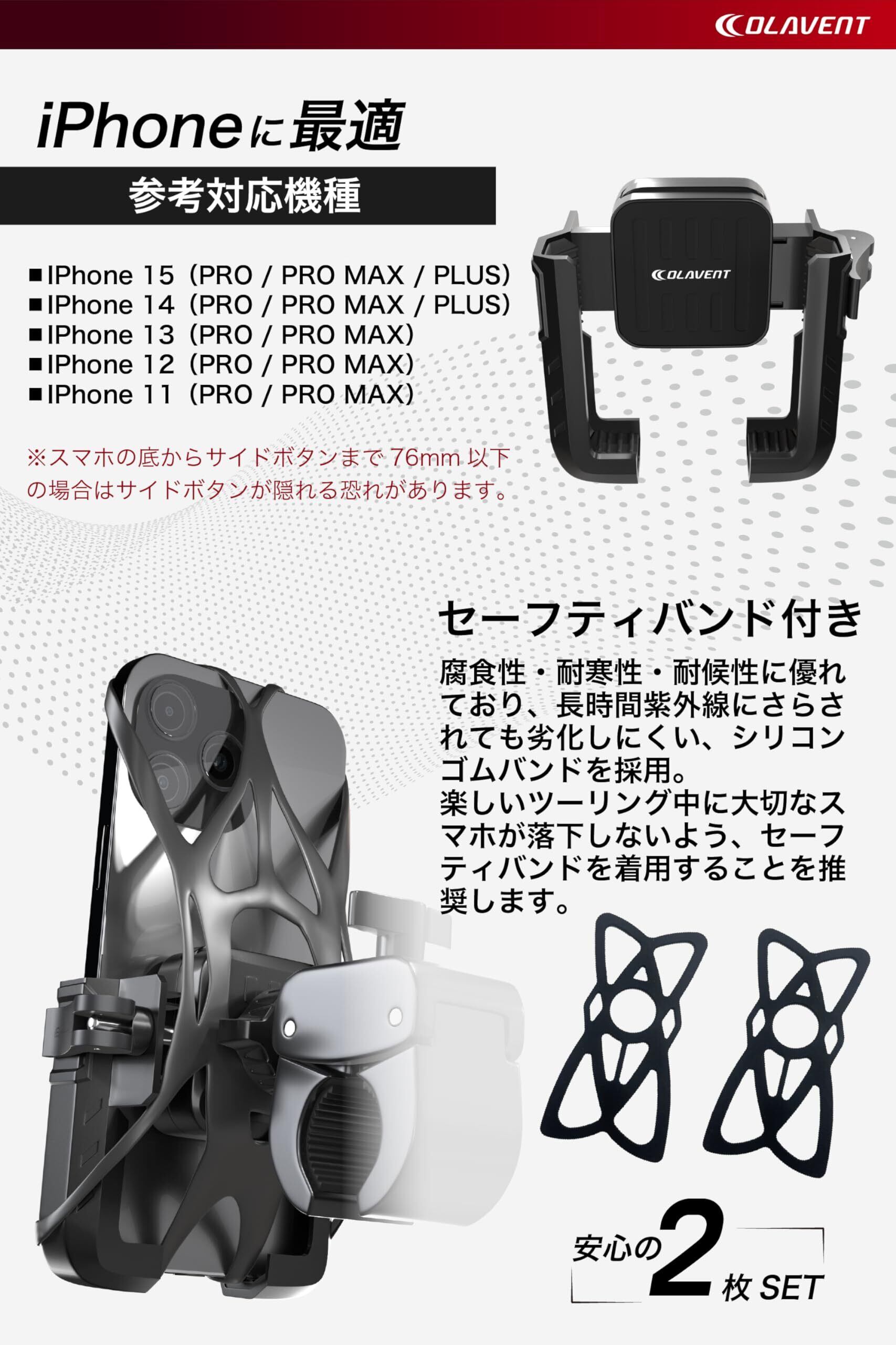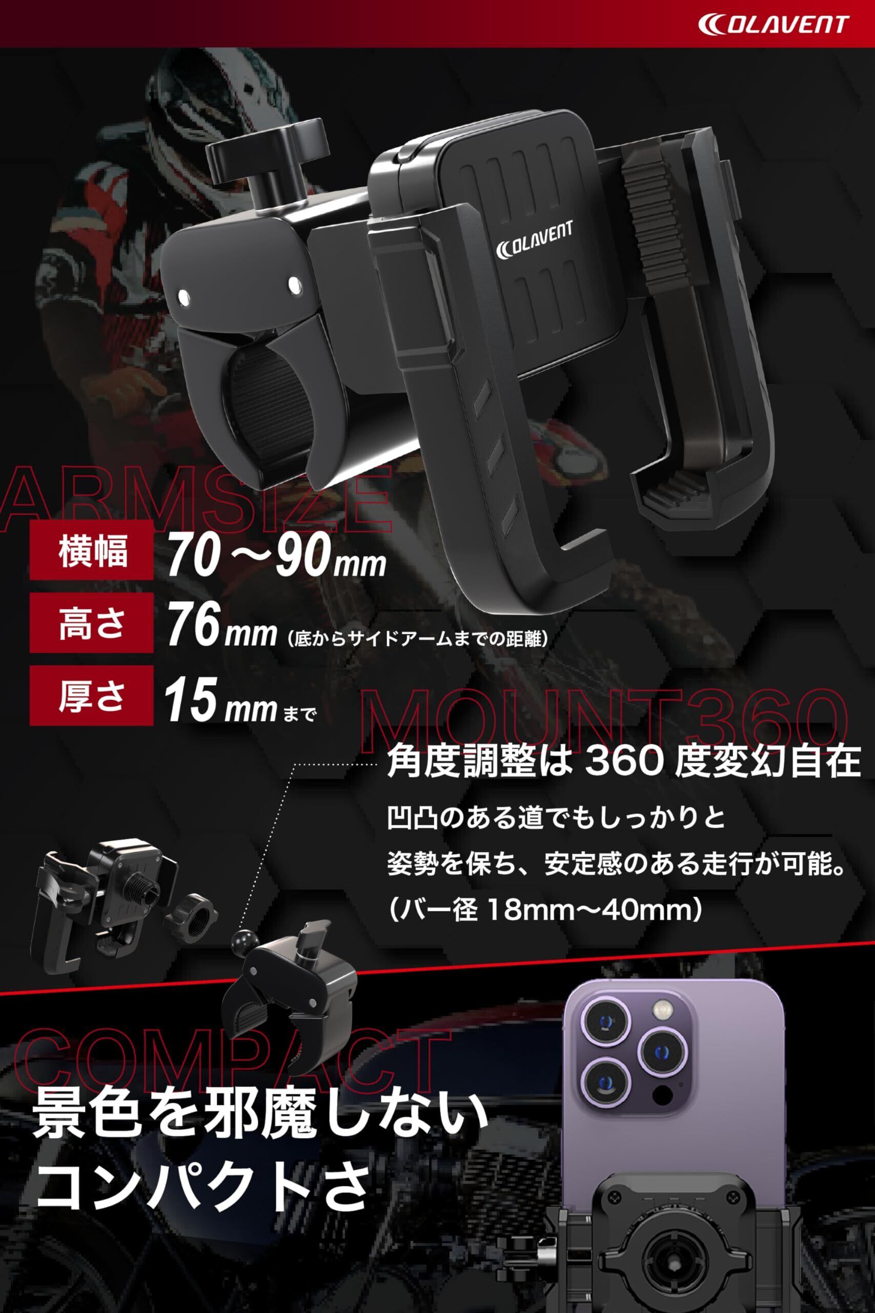 「『OLAVENT バイク スマホホルダー』は、バイクライダーのために設計された必需品です!このホルダーを使うことで、ライディング中も安全かつ快適にスマートフォンを使用できます。」