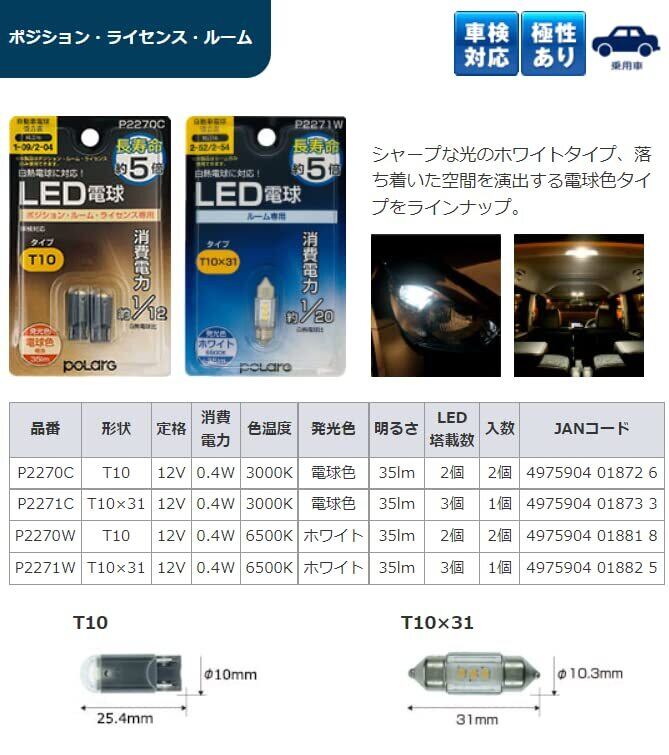 日星工業 POLARG(ポラーグ) ルームランプ用 LED電球 12V T10x31 電球色 3000K 35lm 1個入 白熱電球同等サイズ ECE規則 JIS規格 P2271C 車検対応 信頼の純正バルブメーカー