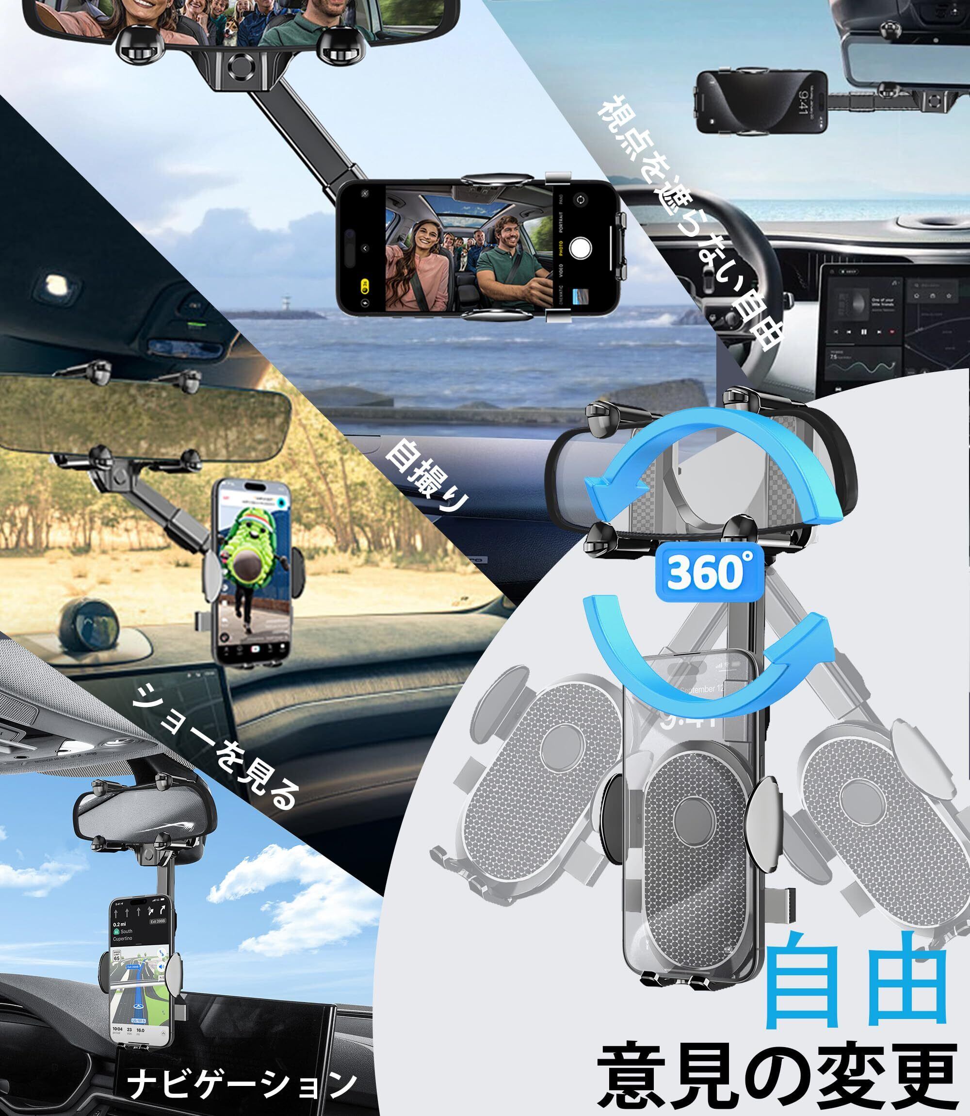 「『Seltureone バックミラー スマホホルダー』は、運転中のスマホの使用を安全にサポートする便利なアイテムです!360°回転可能かつ伸縮式のデザインで、さまざまな視点から操作が可能です。」