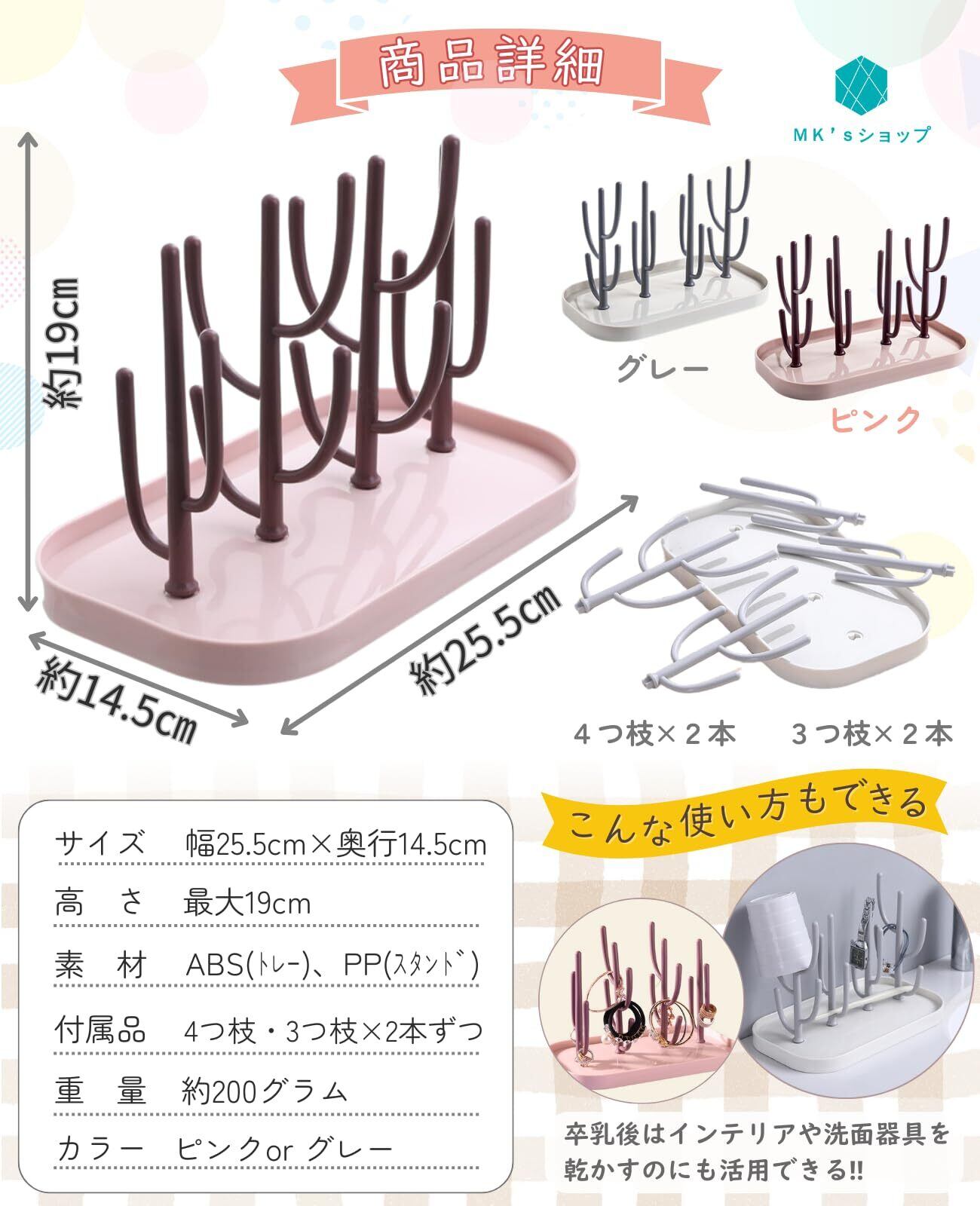 【現役保育士&1児の母が監修】幼稚園教諭、保育士歴17年勤務。保育士と1児の母の目線から様々な商品の監修に携わってきた育児のプロが推薦する商品です!【乾きやすいデザイン】工夫された角度で干せるツリー型の乾燥ラックで、風通しが良く短時間でたくさんの哺乳瓶を乾かすことができます。 【安心設計】ツリーの先端は丸いデザインで、哺乳瓶の内側や乳首などを傷つける心配はありません。また高品質なABS、PP素材を採用しており耐久性にも強くなっています。 【お手入れも簡単】それぞれのツリーは取り外すことができ、お手入れも簡単にできて使わない時はコンパクトに収納できます。旅行や帰省時などの外出先でも持ち運びできて便利です。 【様々な用途で使用できる】哺乳瓶以外でも水筒やコップ、歯ブラシなどの洗面器具にもご活用いただけます。また、小物類やアクセサリーを飾ったりインテリアとしてもお使いいただけます。 【かわいいデザイン】キュートでとてもかわいいデザインなので、ベビー出産祝いのプレゼントにもおすすめします。 【商品詳細】幅25.5cm 奥行14.5cm 高さ19cm 4つ枝×2本 3つ枝×2本 重さ:約200g 素材:ABS(トレー)、PP(スタンド)ABS(トレー) カラー:ピンク/グレー 【安心の30日】品質や検品には万全を期していますが、もし不具合や不良品などございましたら、ご購入から30日以内の場合、全額返金及び返品で対応させていただきます。