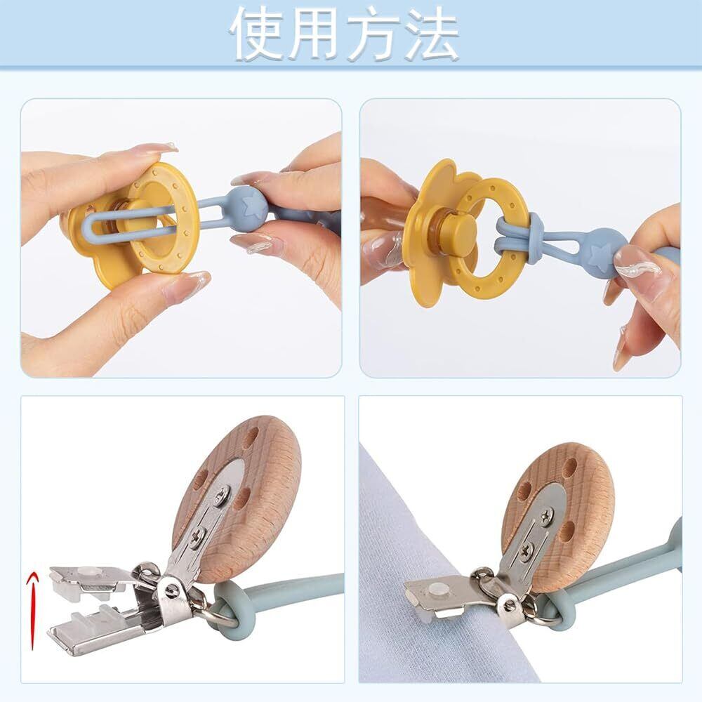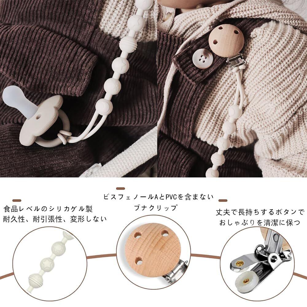 「シリコン製のストラップは、赤ちゃんにも優しく、錆びることがないので長く安心してお使いいただけます。また、木製クリップは耐久性があり、しっかりと衣類に留まります。」