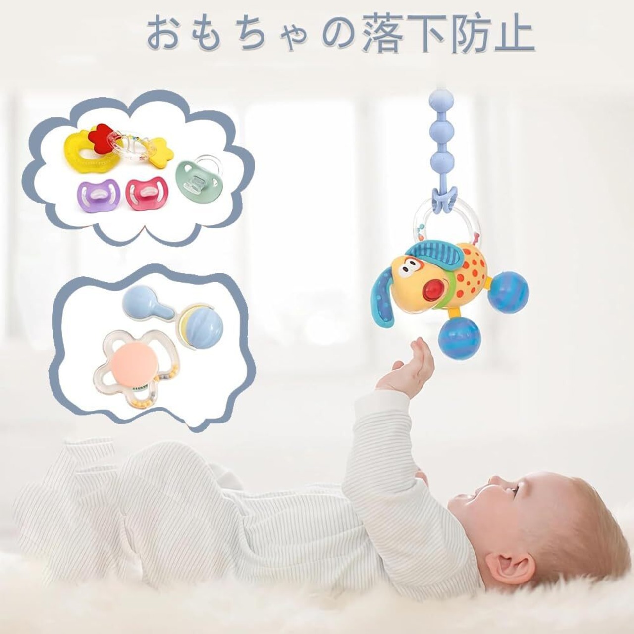 「赤ちゃんが自由に動いても、おしゃぶりをしっかりと保持するので、落下の心配がありません。お外で遊ぶ時やお出かけに最適なアイテムです。」