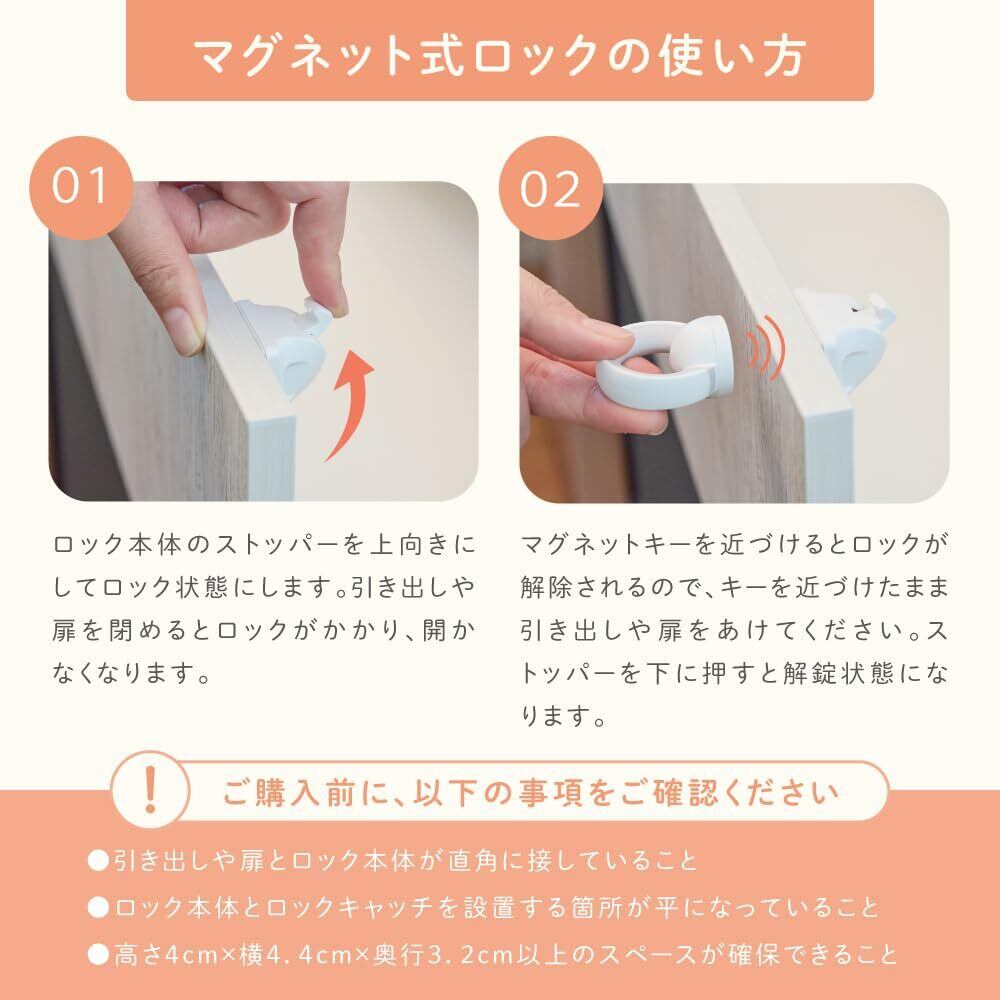 「強力なマグネットを使用したロック機構により、赤ちゃんが気になる引き出しや扉を開けられないようにします。大人は簡単に解除できるので、ストレスフリーでご使用いただけます!」