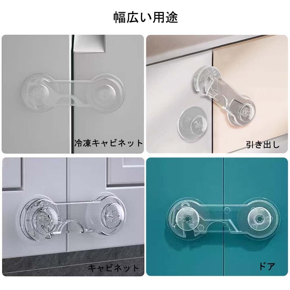 「『チャイルドロック』は、お子様の安全を守るために設計された便利なアイテムです!透明なデザインが特徴で、家具の美観を損なうことなくしっかりと固定できるのが魅力です。」