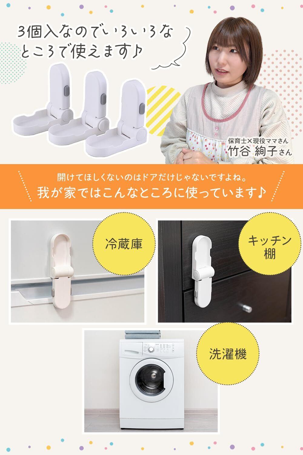 「ドアはもちろん、引き戸やキャビネットにも使用可能。家の中の様々な危険を未然に防ぎます。特に、子どもが一人で遊ぶ際にも安心です。」