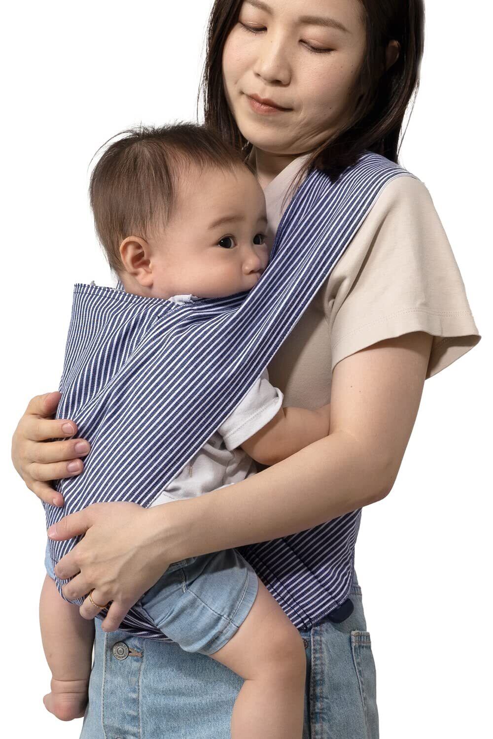 【サイズ調整可/パパも使えるシンプルデザイン】 落ち着いたネイビーのボーダー柄で男女問わずお使いいただけます。普段着はもちろん、通勤着などでも合わせやすく毎日大活躍できます。パパも恥ずかしくないデザインと体型に合わせてサイズ調整できるので、ママからパパに抱っこチェンジも可能です。
