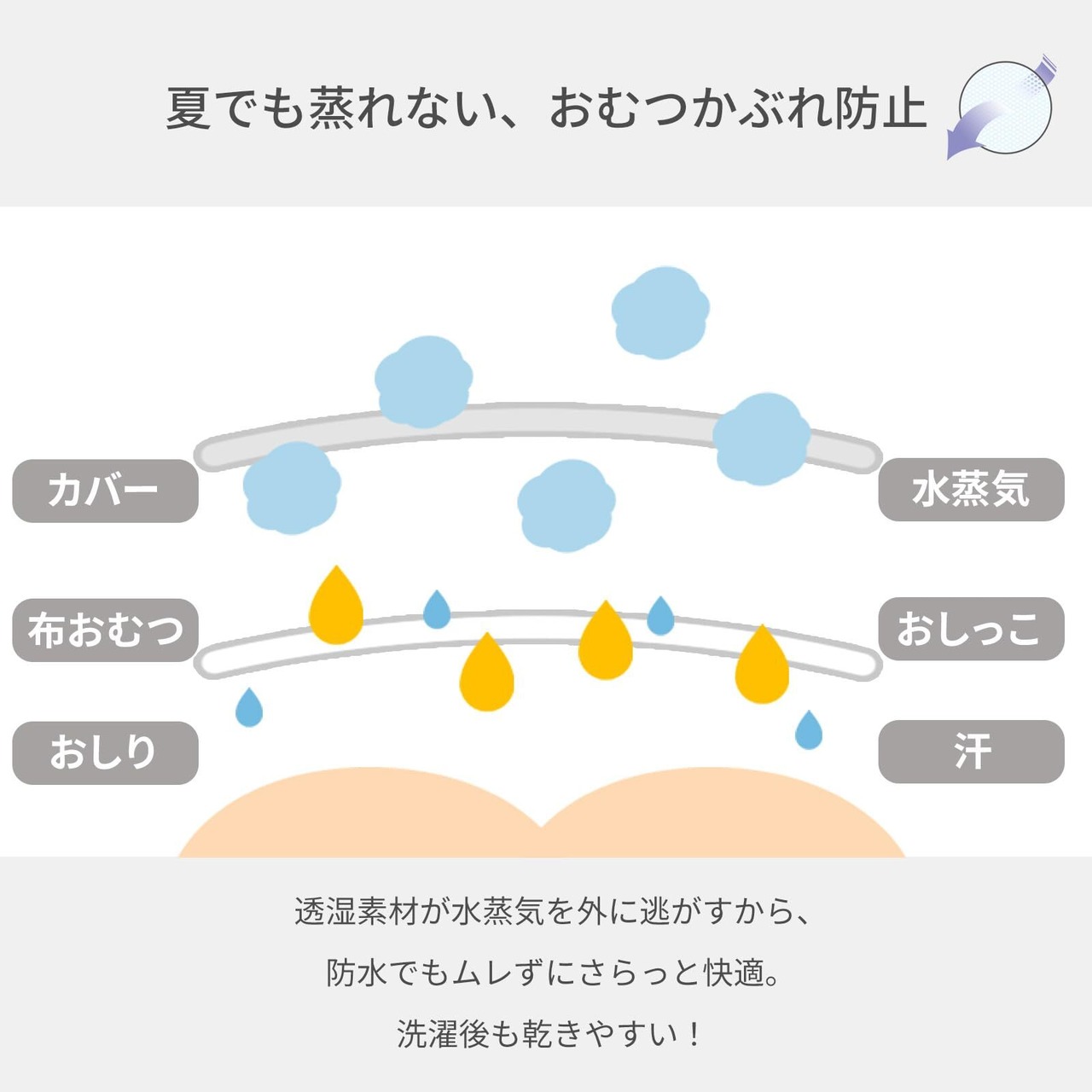 「漏れの心配をせず、安心しておむつを使用できるように防水加工が施されています。外出時にも心強い味方となるおむつカバーです。」