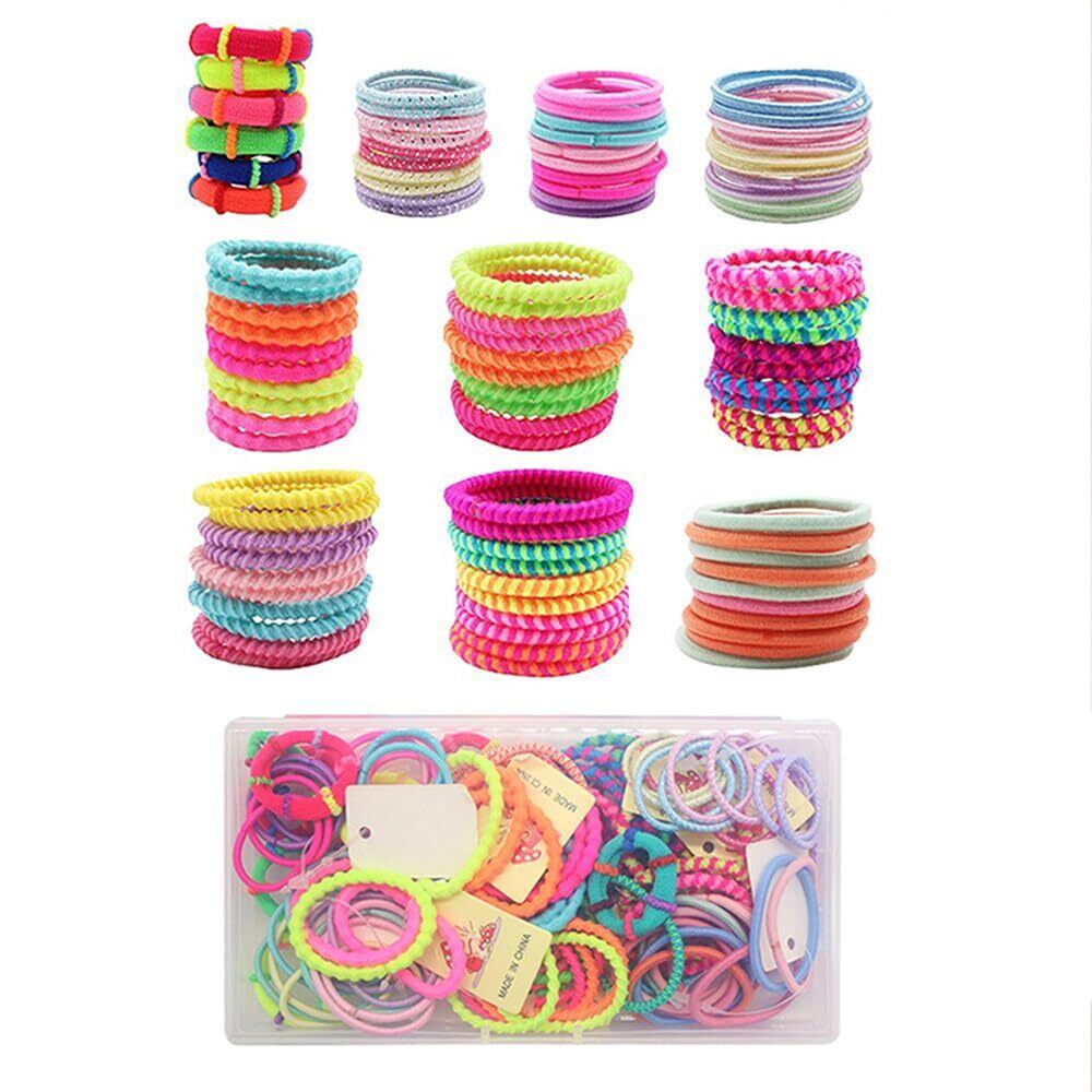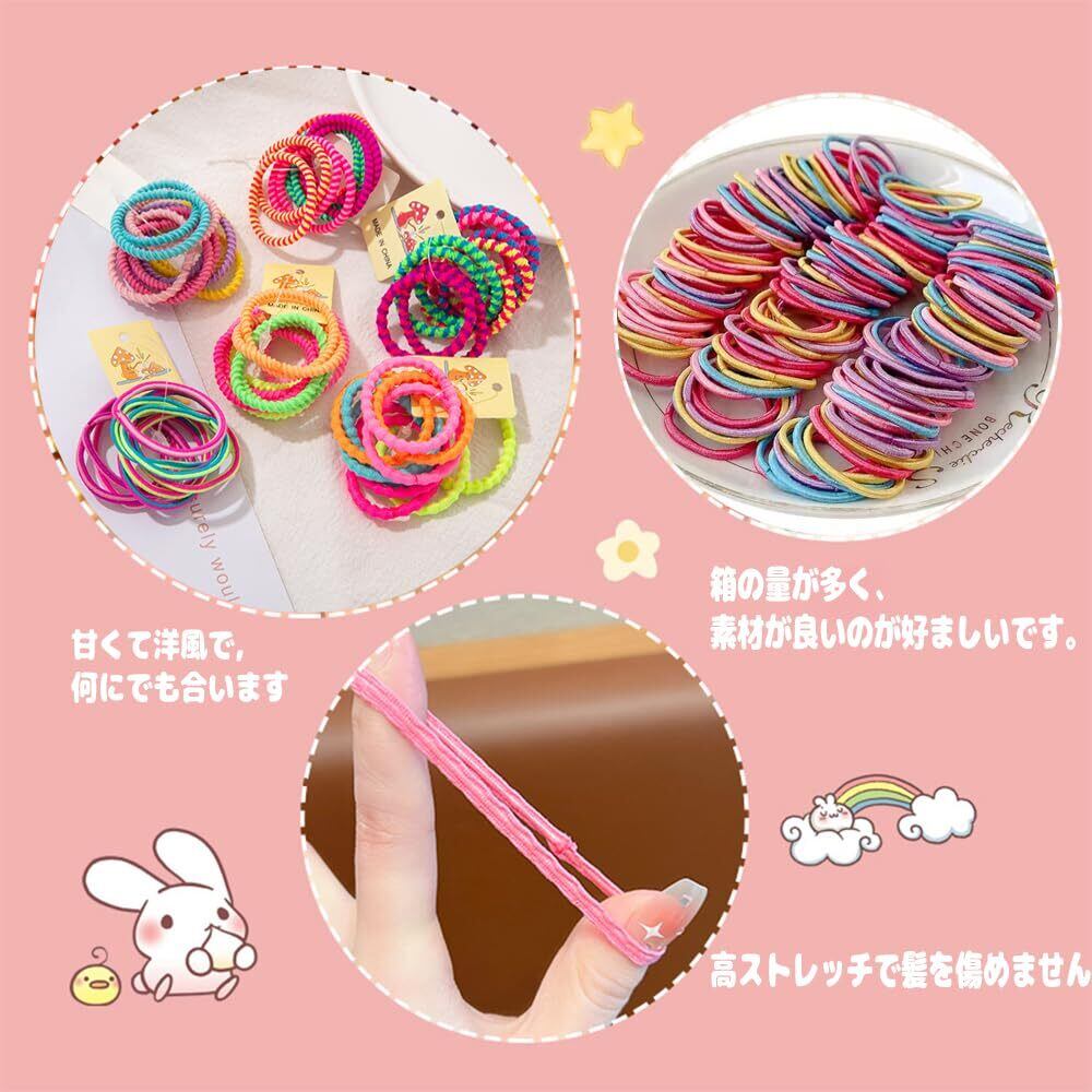 「100個入りの大容量セットなので、保育園やご家庭で大活躍します!色とりどりのカラフルなヘアゴムは、お子様の気分に合わせて選んでいただけます。」