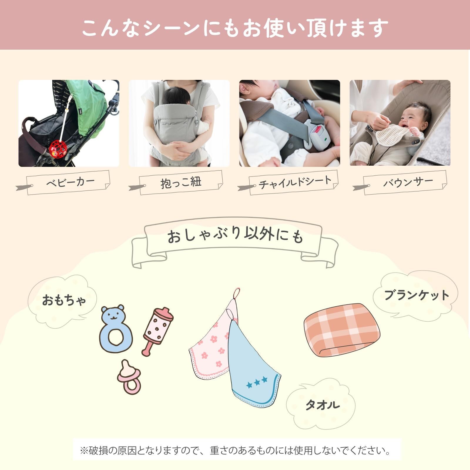 「クリップタイプのストラップが付いており、おしゃぶりが落下してしまう心配がありません。外出時でも安心して使用できるアイテムです!」