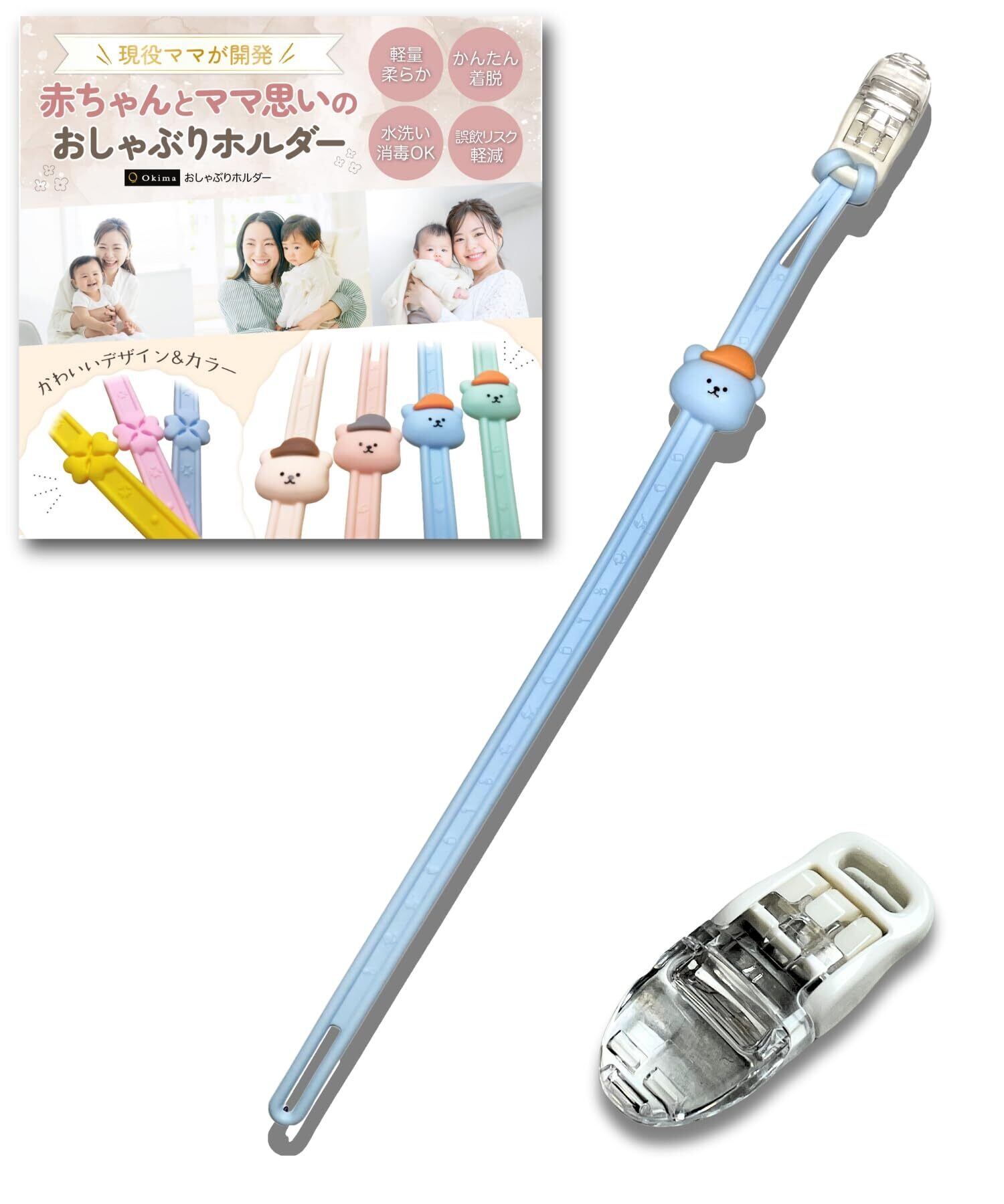 Okima 【保健師推薦】 おしゃぶりホルダー シリコン おもちゃ ストラップ【日本製 クリップ】 かわいい おしゃれ プレゼントにも 落下防止 (ブルー くまさん)