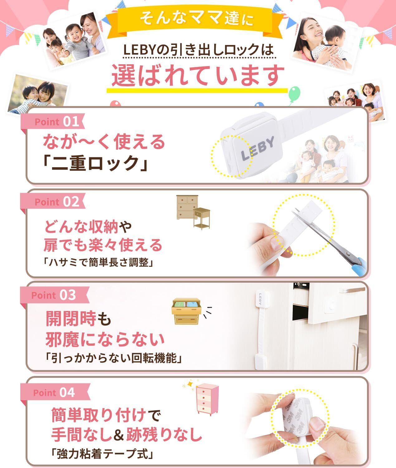 「くっつけるだけで簡単に取り付け可能。ドアや引き出しにしっかり固定され、工具不要で手軽に設置できるので、忙しいママやパパにぴったりです!」