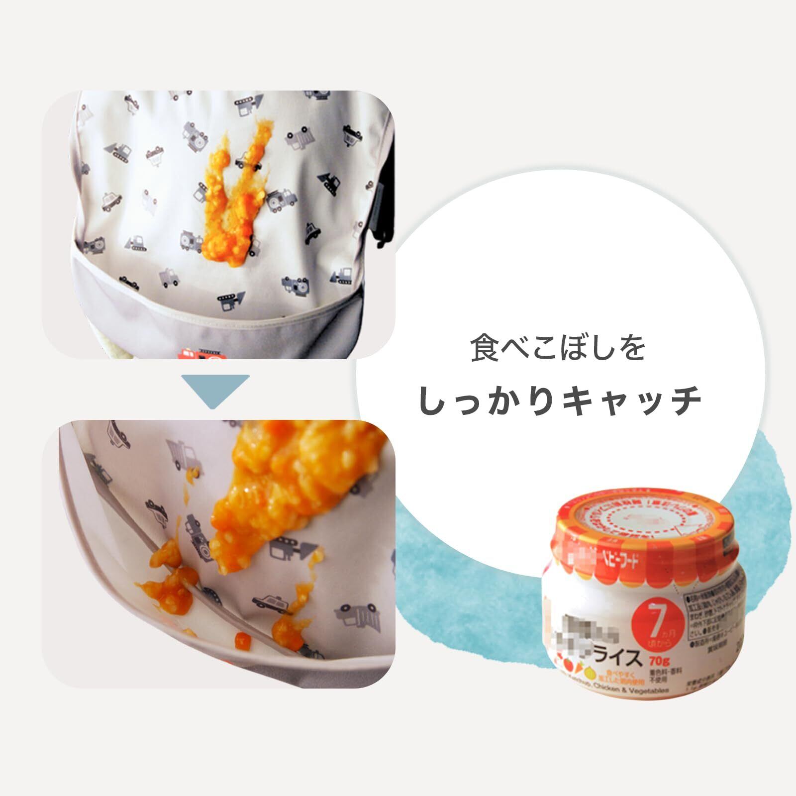 「エプロンには、くるりんポケットが付いており、食べこぼしをしっかりと受け止めます。食卓や洋服を汚さずに済むので、育児の手間を減らせます!」
