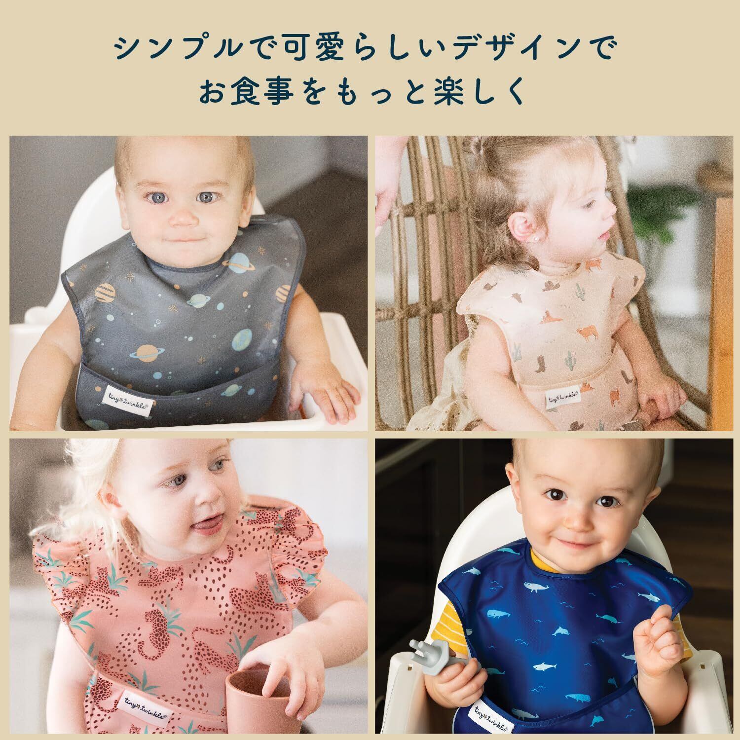 「『タイニートゥインクル イージービブ』は、赤ちゃんや幼児の食事をスマートにサポートするためにデザインされたエプロンです!特に離乳食や保育園での使用に最適なアイテムです。」