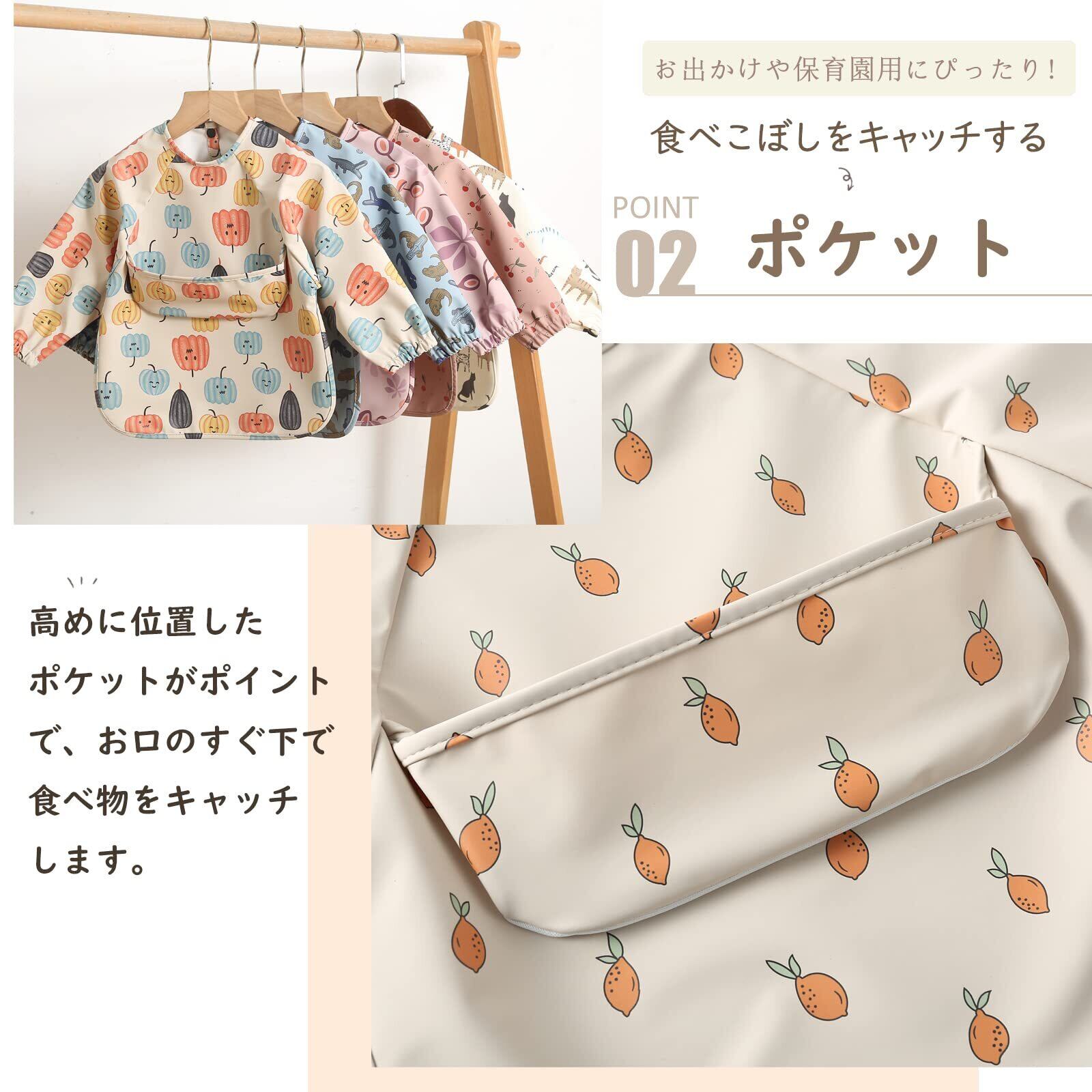 【実用性、使いやすさ】お口のすぐ下にポケットがあるため、こぼれた食べ物をすぐキャッチ。食べこぼしを最小限に防ぎます。洗濯機で洗うこともできます。軽くてシワが出来づらい生地なので、丸めたり畳んで小さくして持ち運びが楽です。お食事はもちろん、砂場遊び着やお絵かき着にもオススメです。