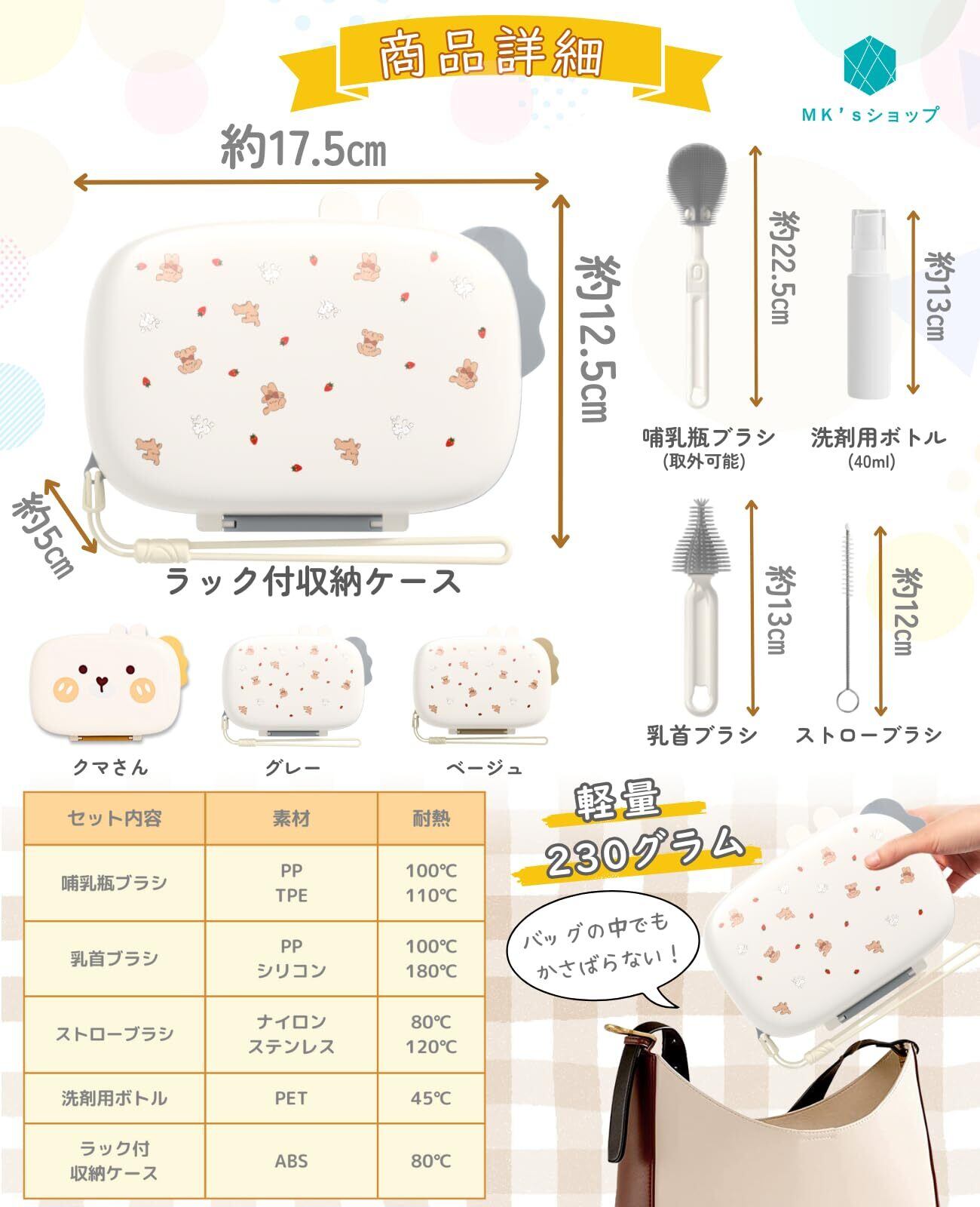 【商品詳細】●サイズ:幅約17.5cm 奥行約12.5cm 高さ約5cm ●重さ:約230g ●セット内容:ラック付収納ケース×1、哺乳瓶ブラシ×1、乳首ブラシ×1、ストローブラシ×1、40ml洗剤用ボトル×1 ●カラー:クマさん/グレー/ベージュ