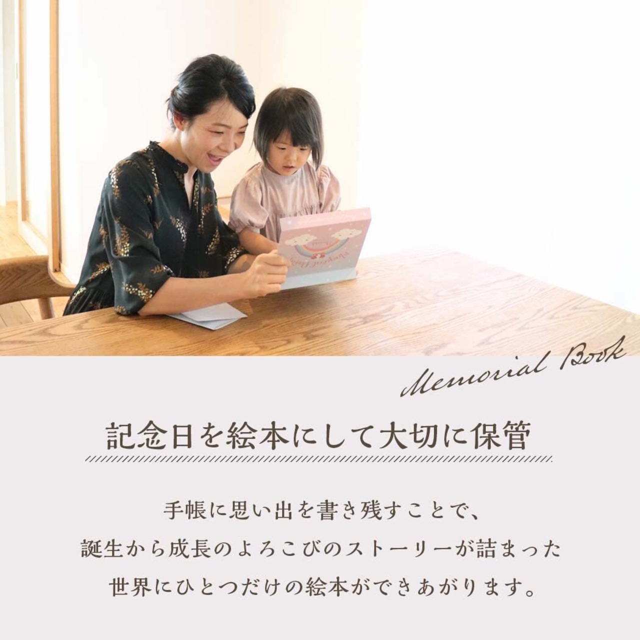 「可愛い本型のデザインは、お部屋に飾っても素敵なアクセントに。お子様が大きくなった後でも、思い出を振り返るのが楽しみになることでしょう。」